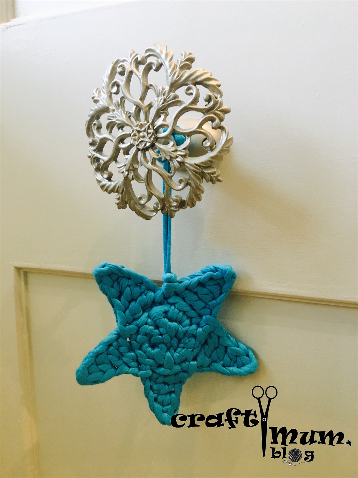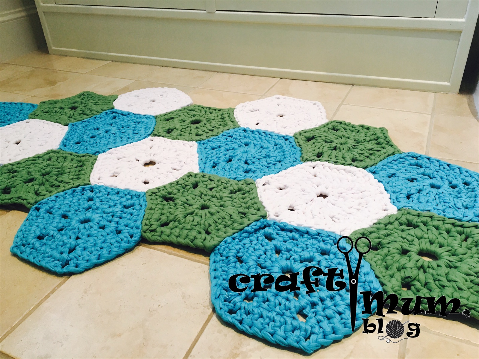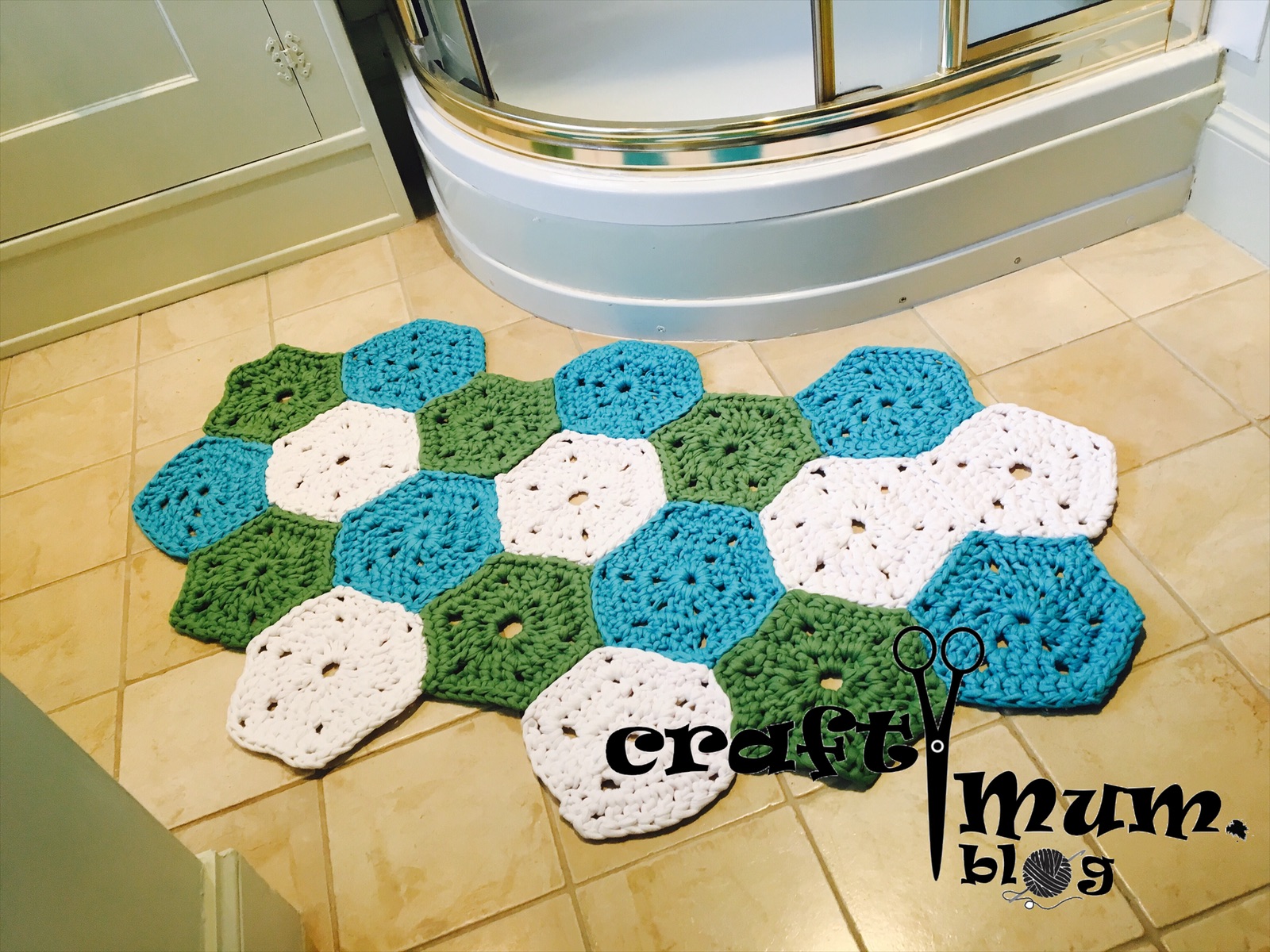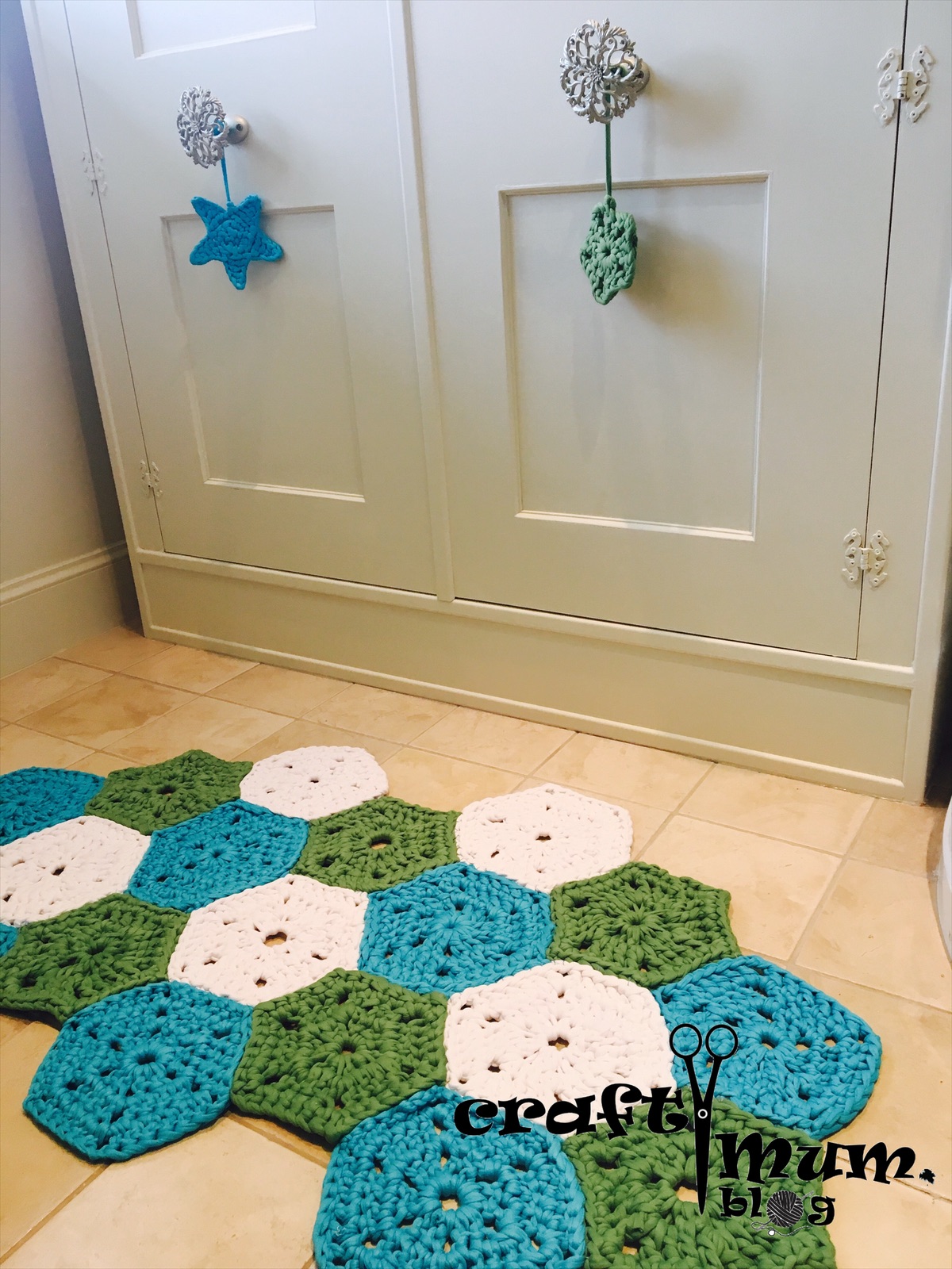This is a bath rug I made using hexagons. You can find patterns and videos online. I used tshirt yarn and a large hook and love it. I really like using tshirt yarn or chunky yarn for projects. I made some ornaments as well to match my rug. I recomend Hooked Zpagetti. Have tried 3 or 4 brands and this has the best elasticity and consistency in my opinion. Do not combine two different brands in same rug as they will be different.