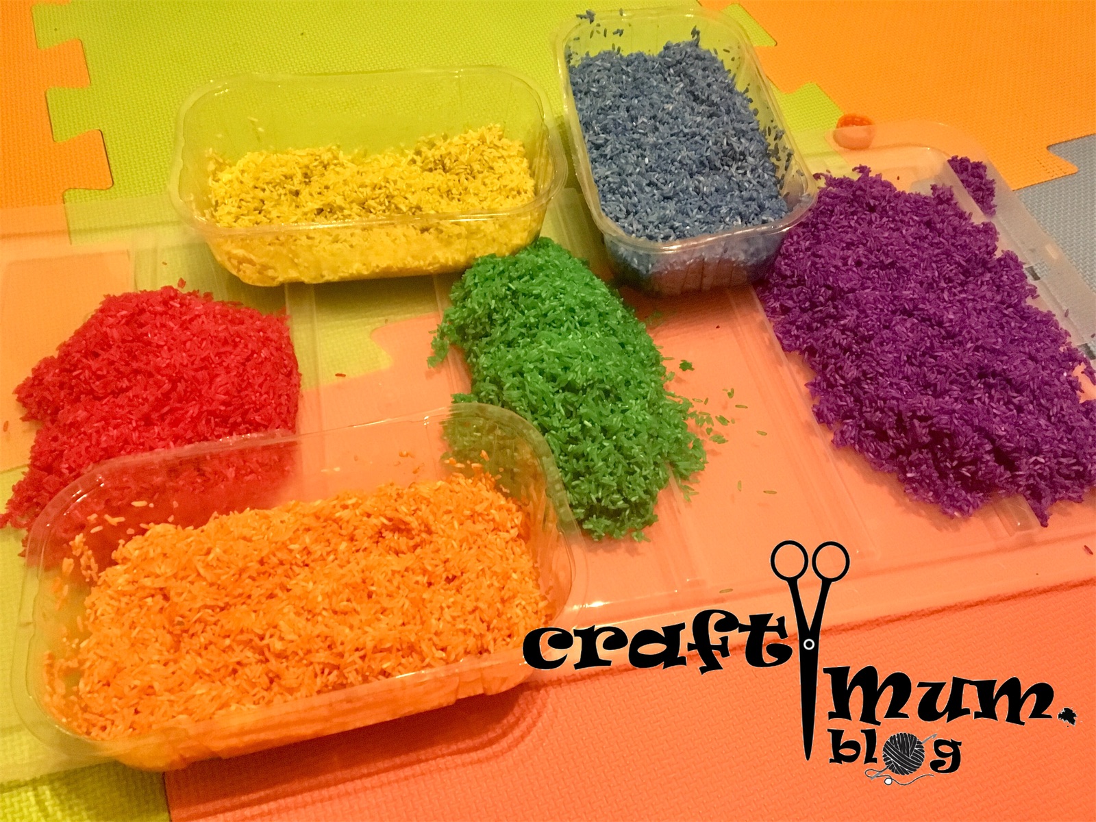 Get child to pour solutions on the rice and let it fizz. Do not use more liquid than needed. If it’s too much just add rice after and stir. Once coloured put it to dry on a plastic bag. This can be a bit smelly so put it outside or in a ventilated bathroom. Once done, you won’t fell the smell and it will go away with each play. Store in plastic box or fabric/plastic bag.