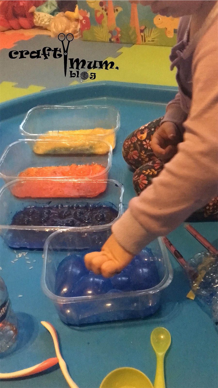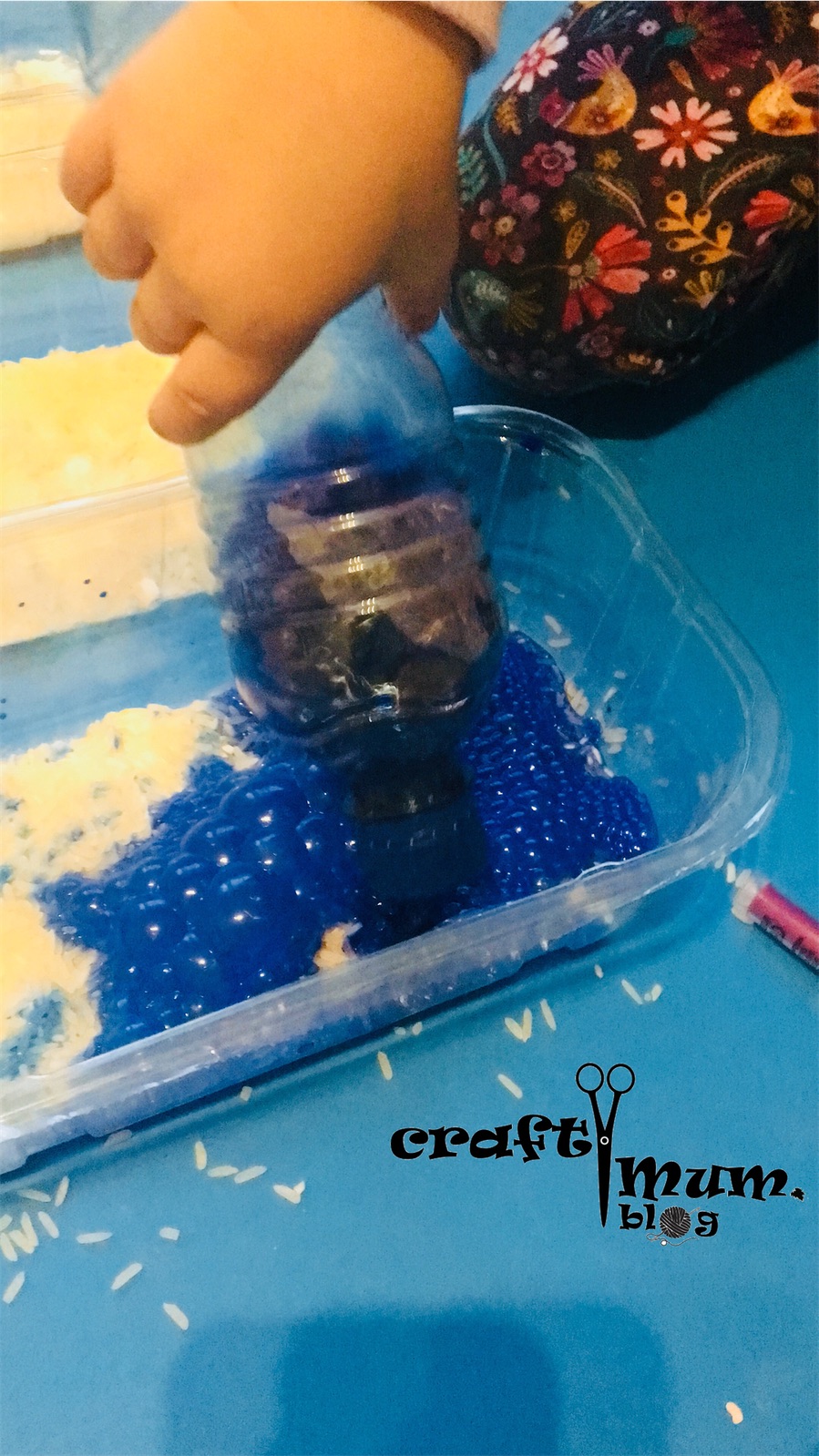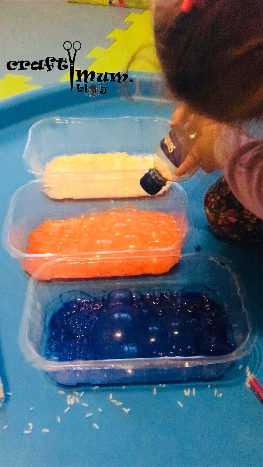 Coloured rice it’s great for play and lasts long. Why not making an experiment out of it? Bubbles!