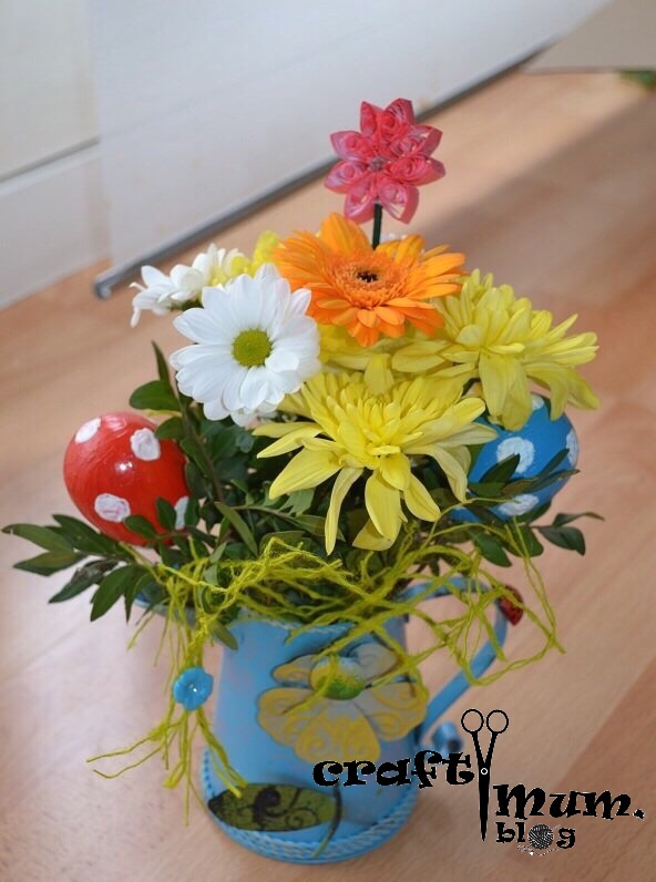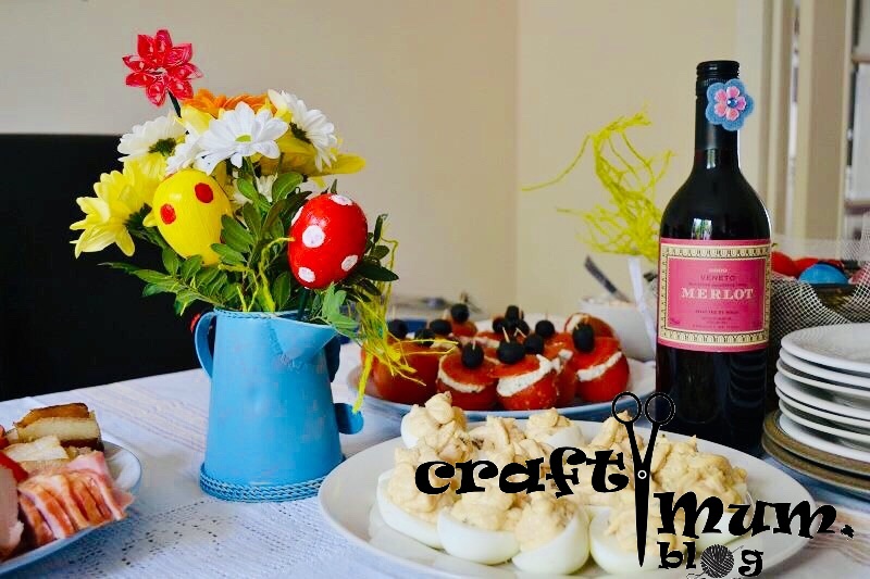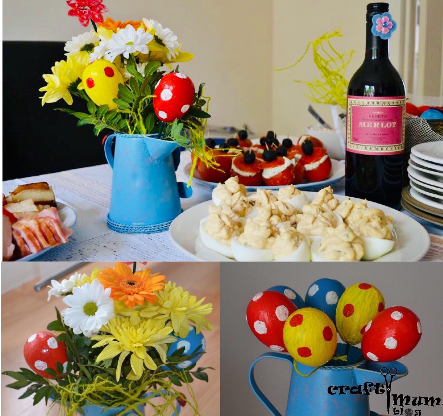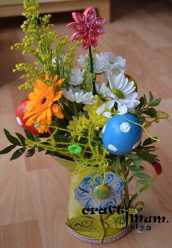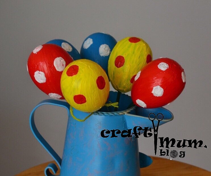 Paint some egg shells and put them on some barbecue sticks. Make a flower arrangement and add the eggs.