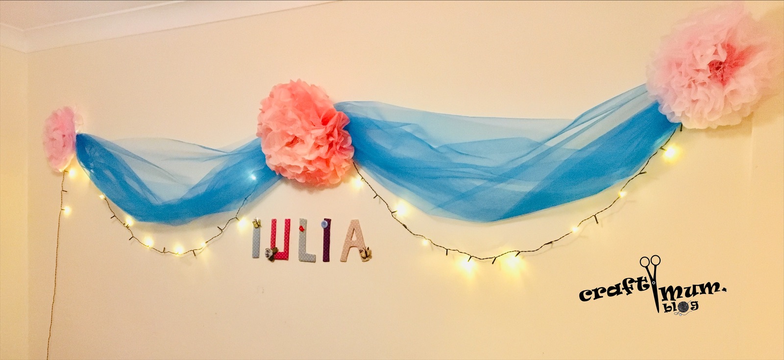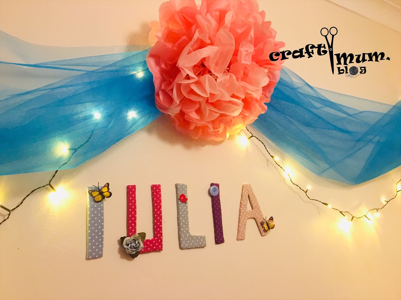 Cut letter from a cardboard box then wrap them up in fabric. Use some UHU glue or a glue gun and add some buttons and flowers for decorations.