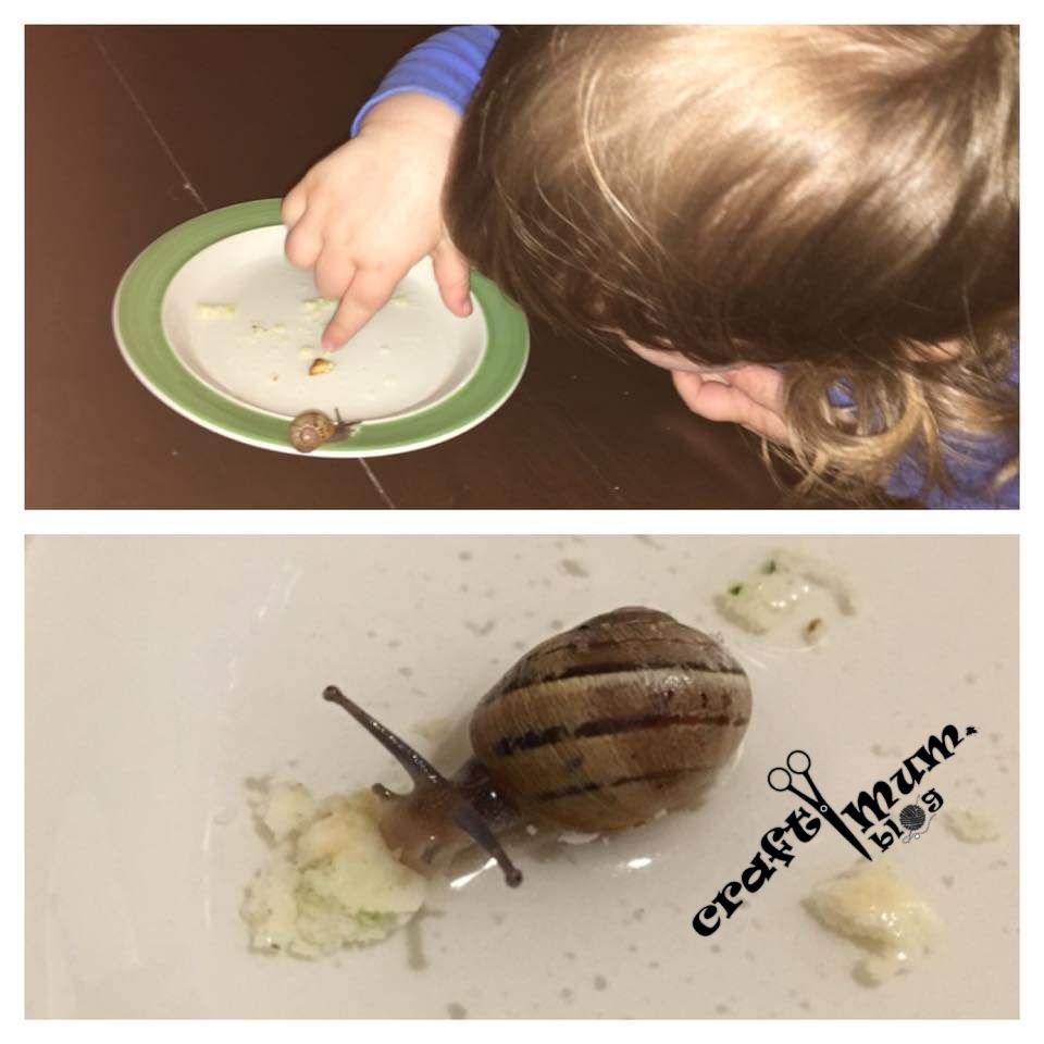 Just get a snai or too and add some water and some bread to a plate. Place it on it and wait until they get out to eat. Might help to bring them close to the bread to sense the smell. They might soil your plate, but that in itself seems to be funny for kids. Do put the snail back in nature, maybe give it a name and say bye, bye.