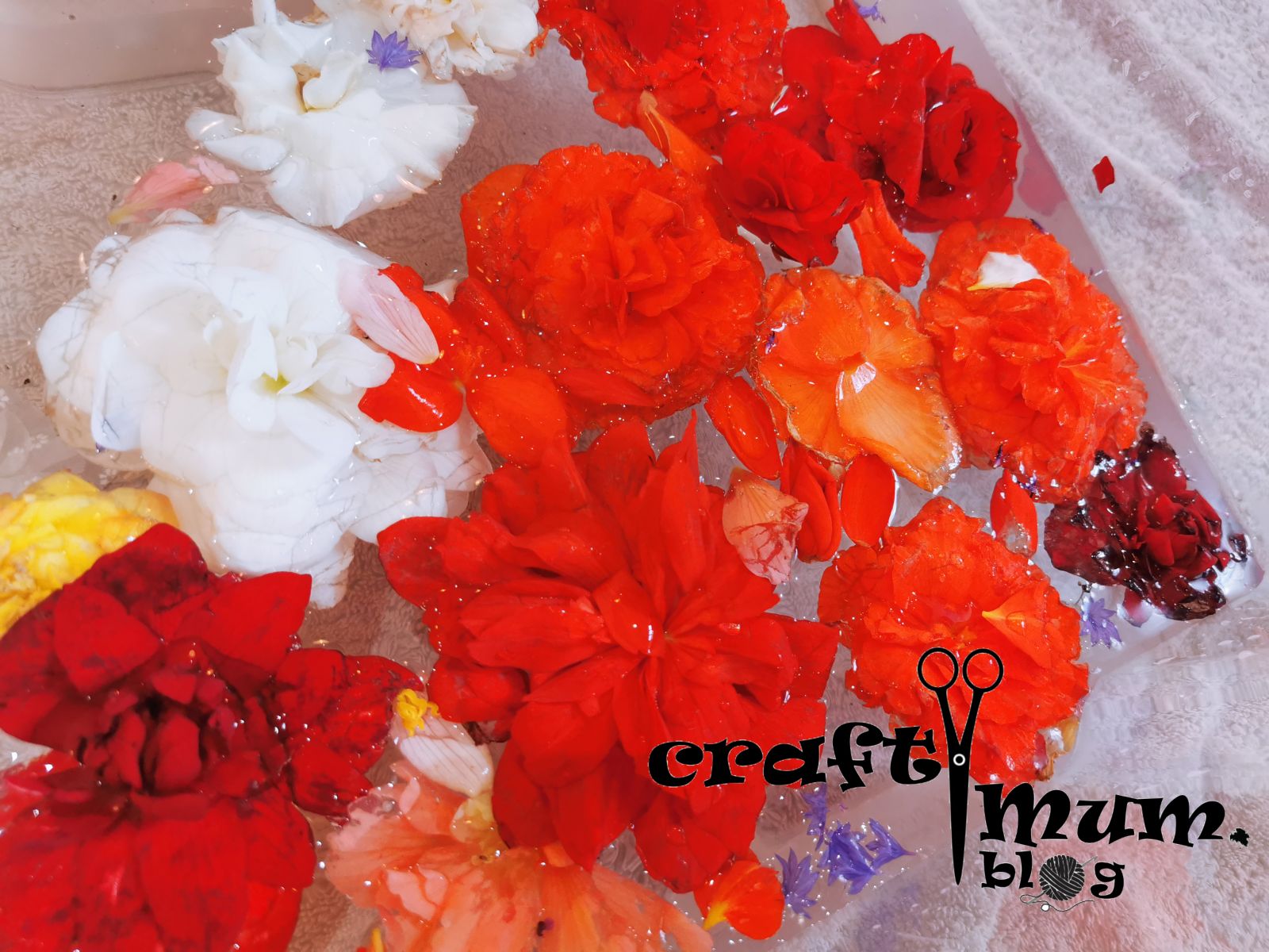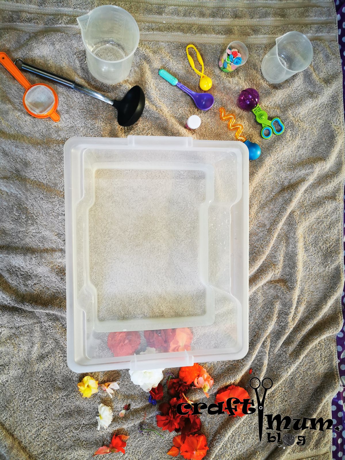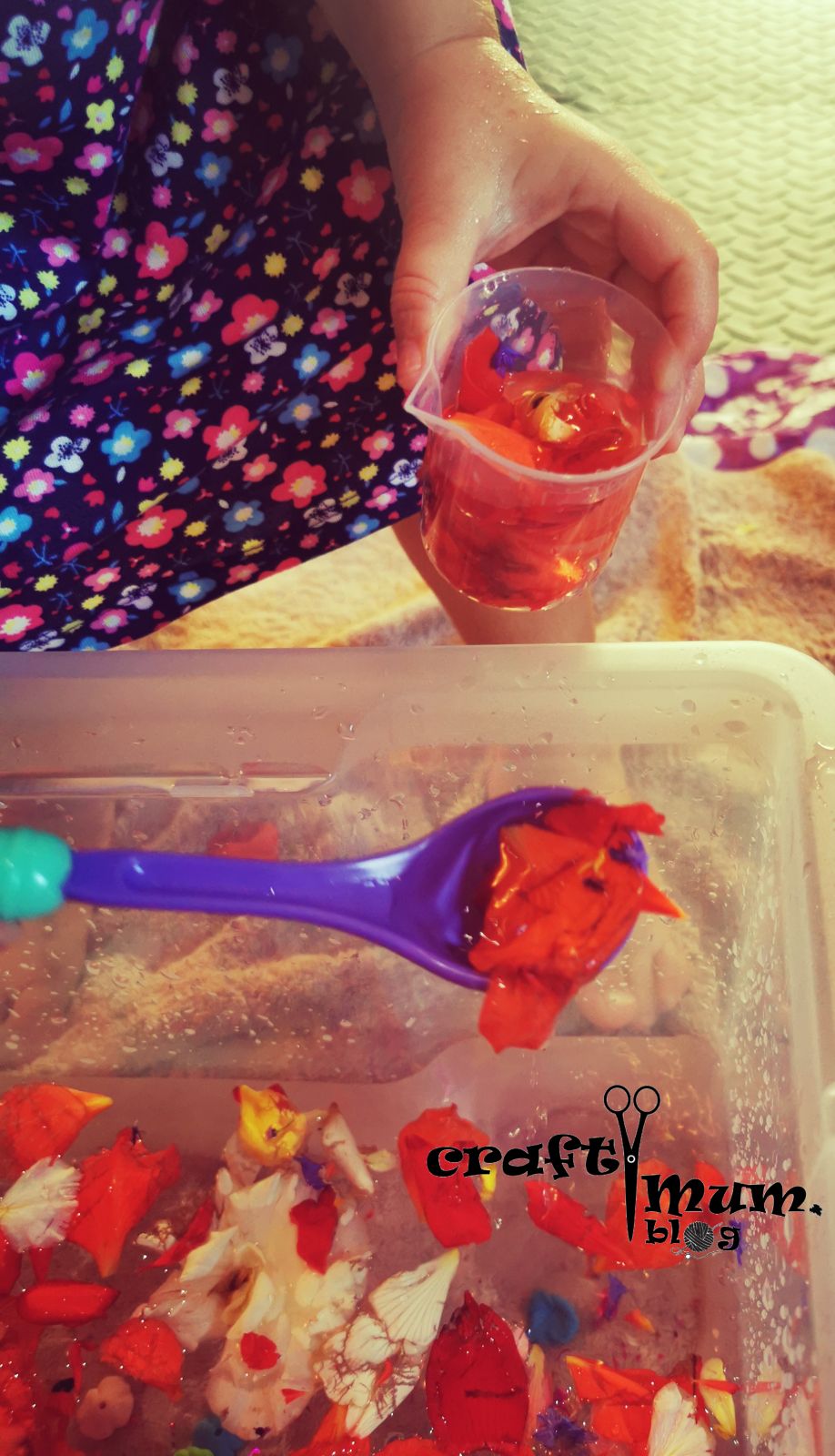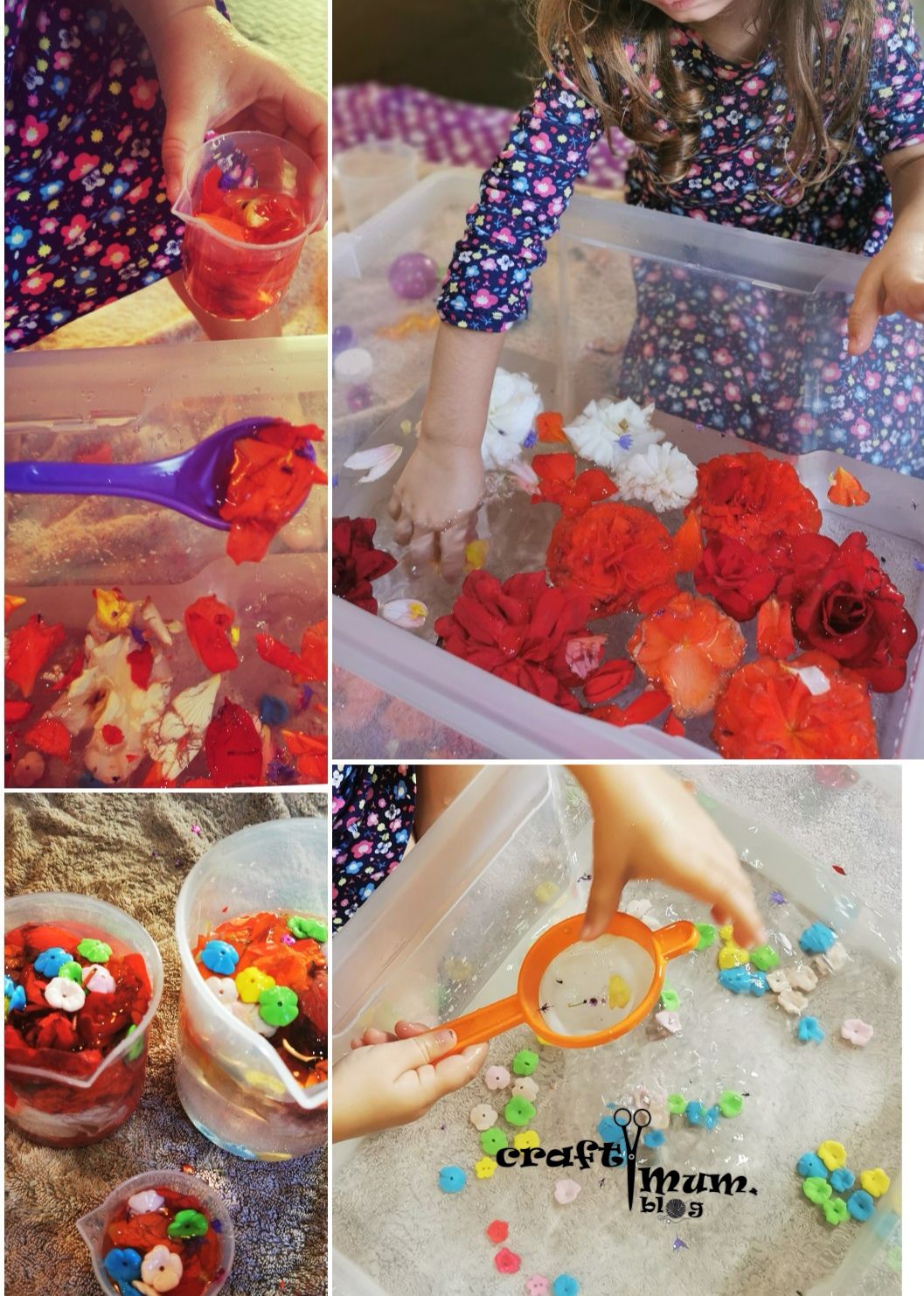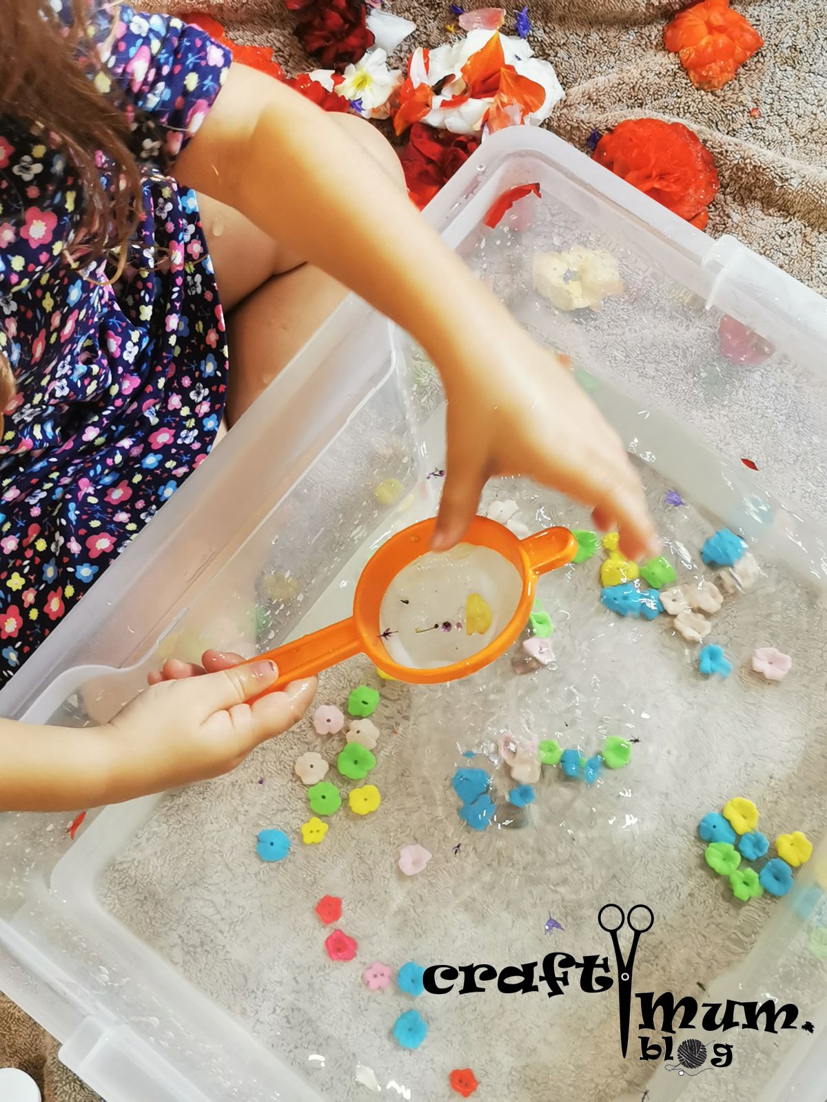 This is an easy and colourful summer activity. You need water, flowers and kitchen utensils (I added flower buttons too and she pretended the were salt and spices).