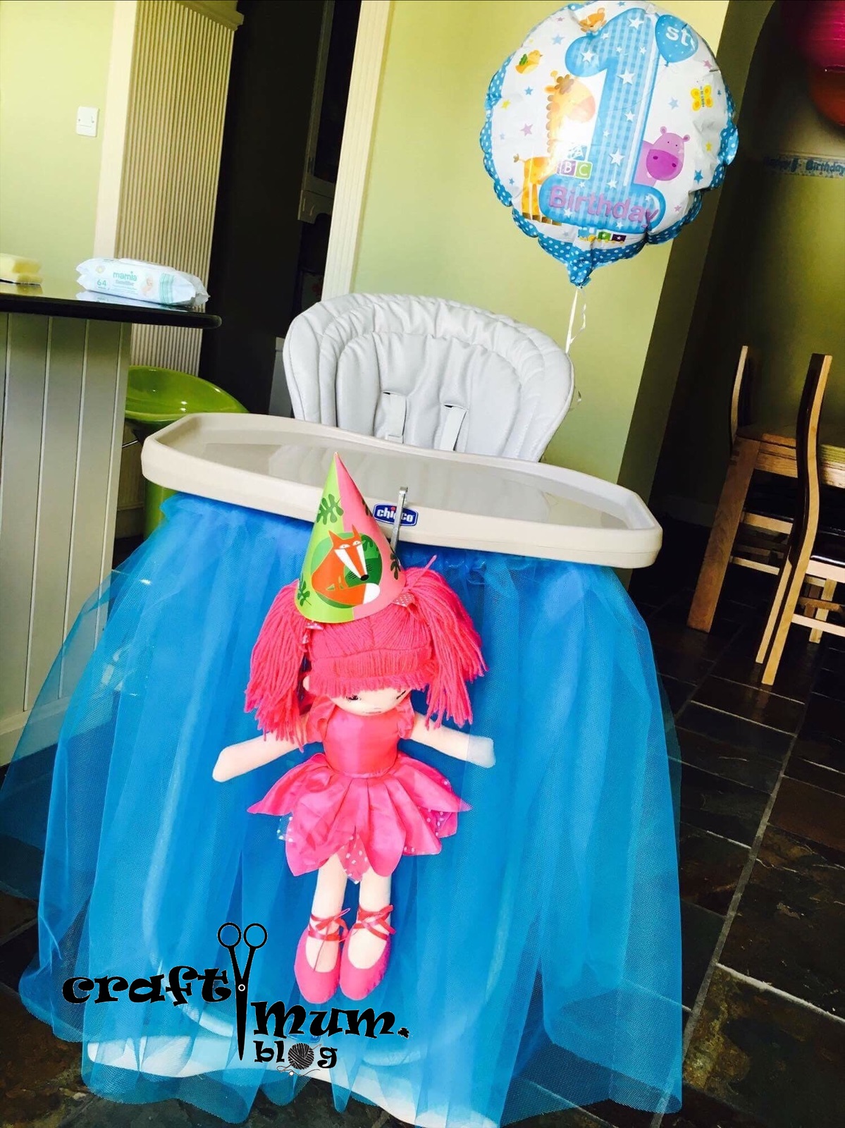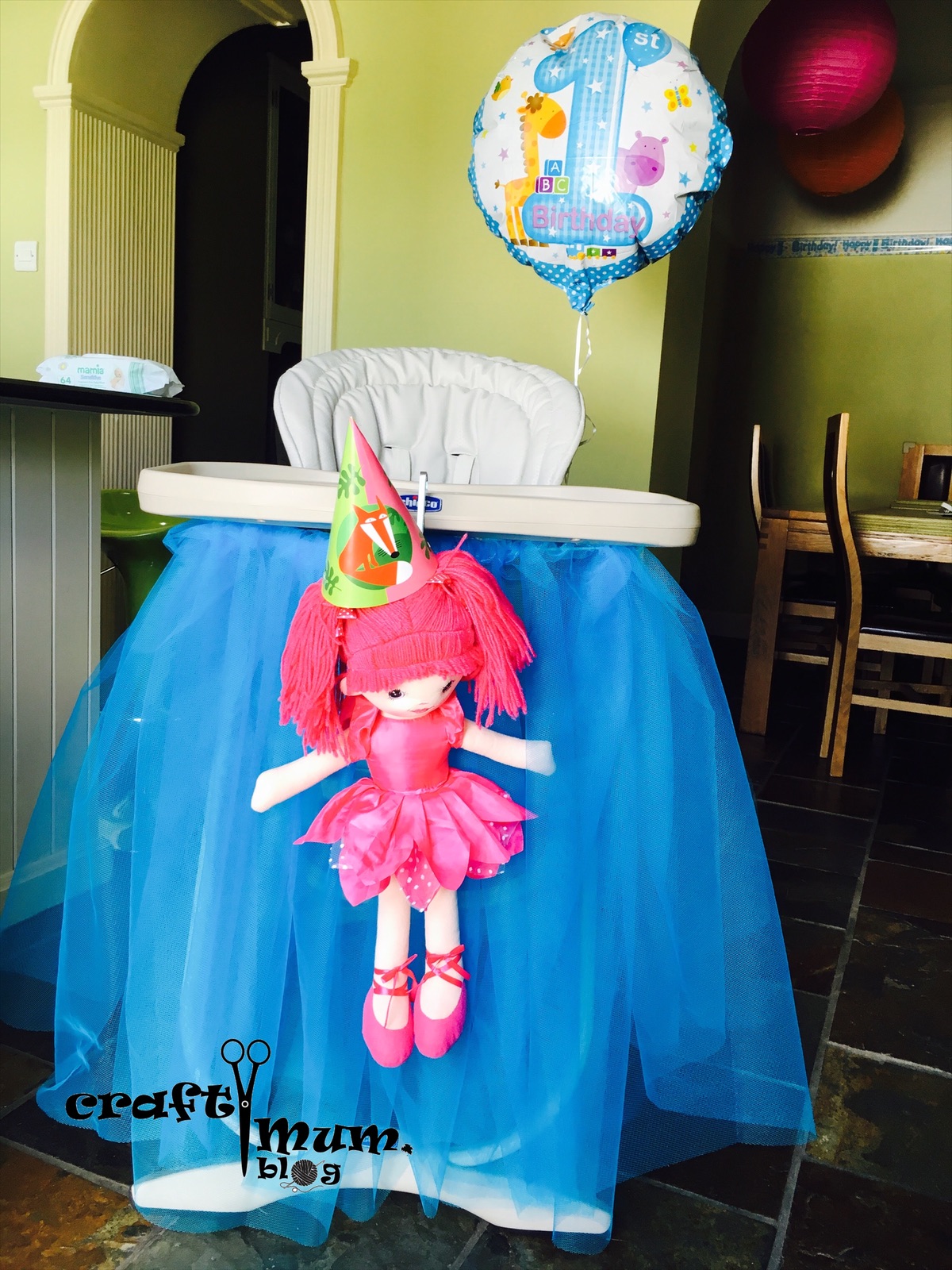 Here is an easy idea for a first birthday. Decorate the high chair of the birthday girl with a tutu skirt and a doll. I did not actually use a tutu skirt, just net fabric on an elastic band.