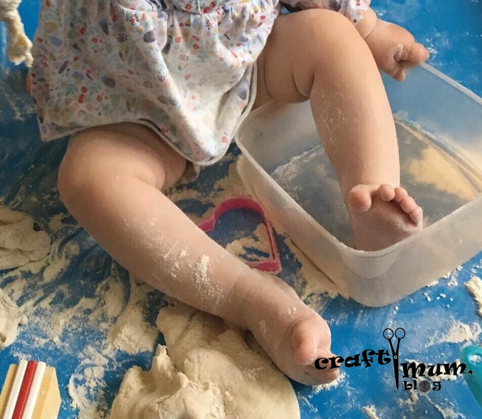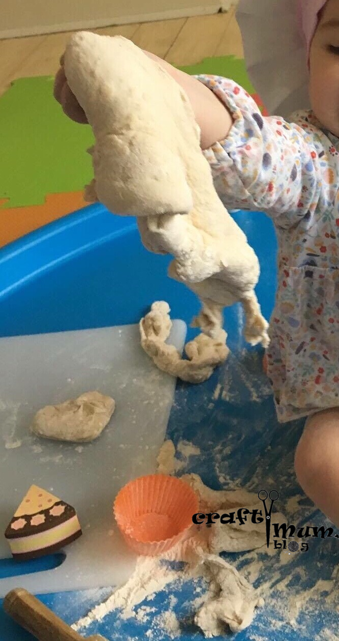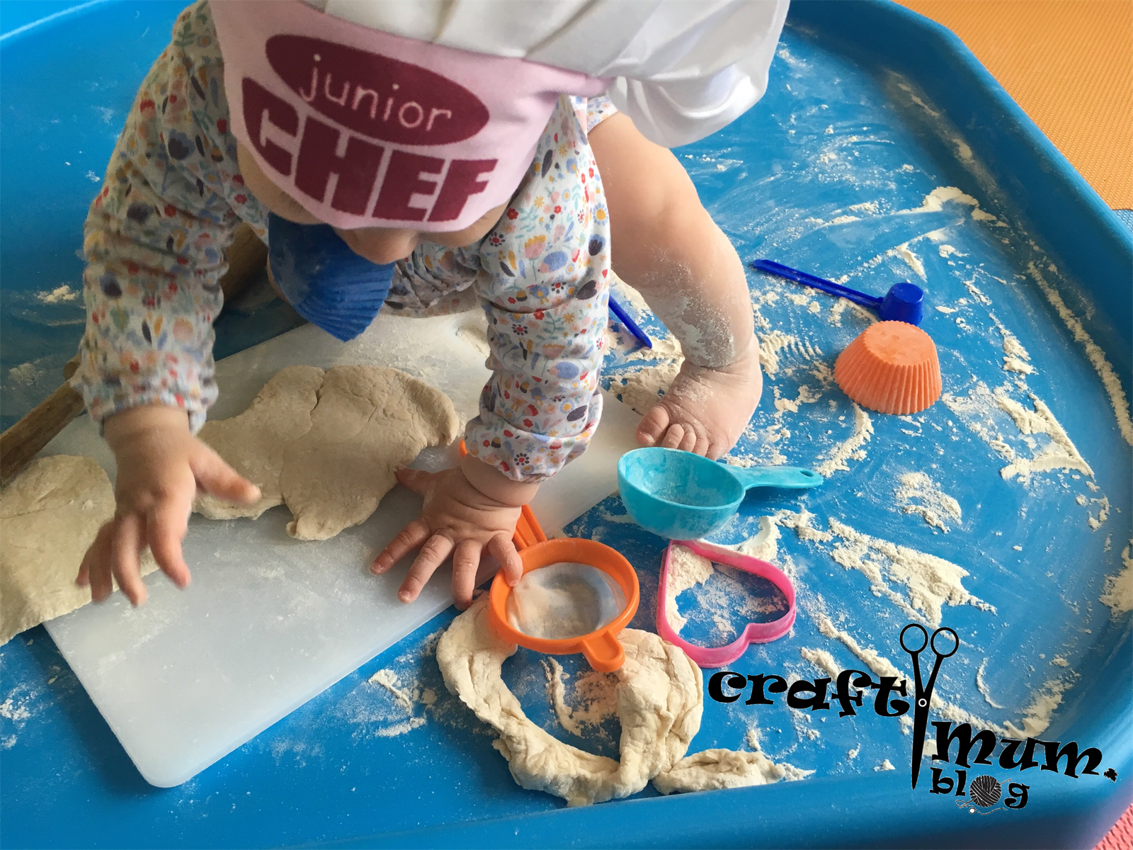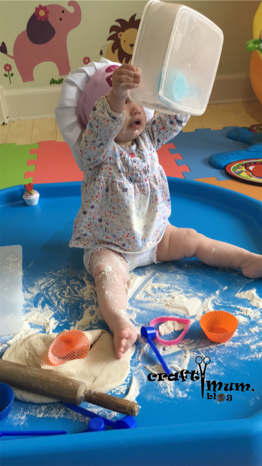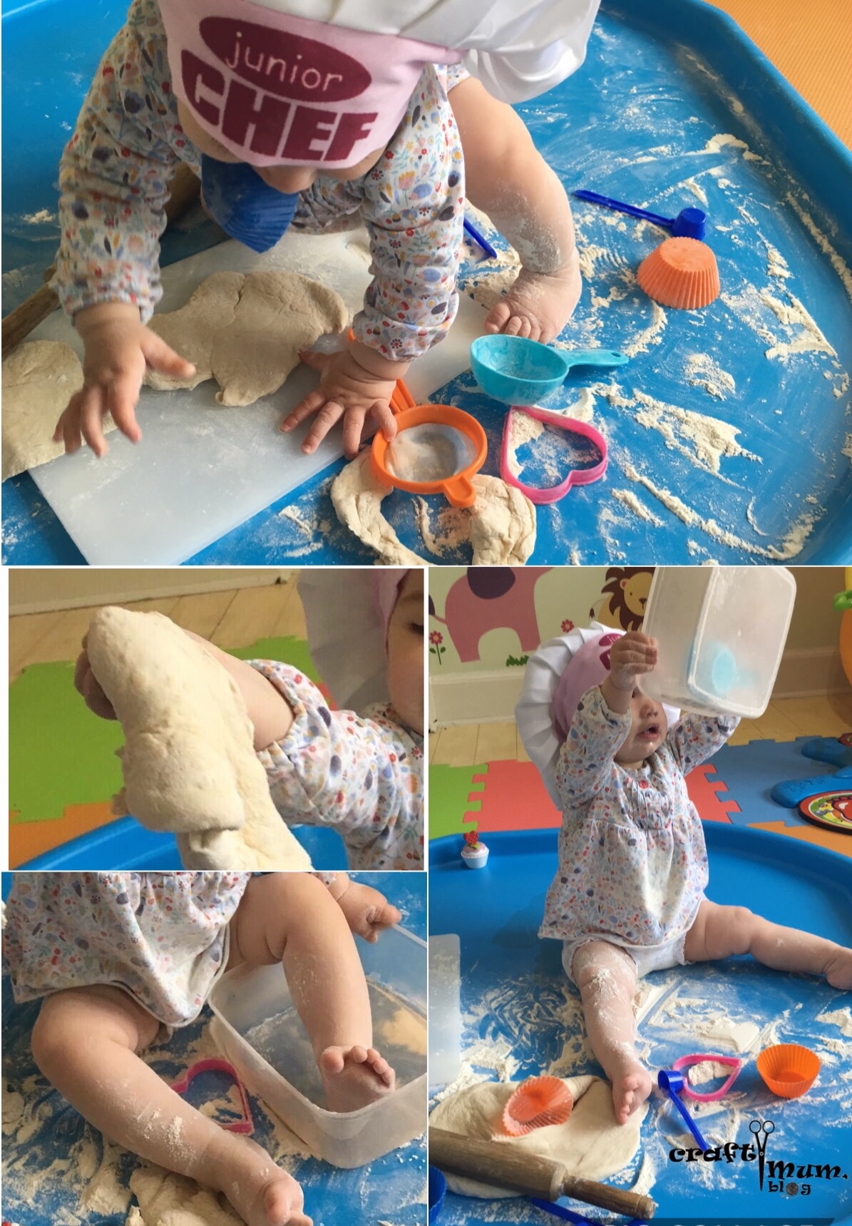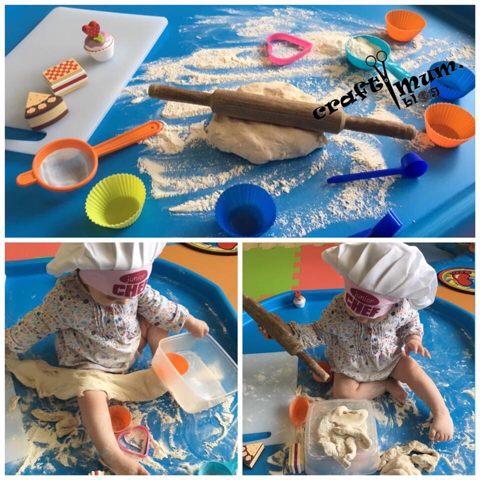 Put some dough and flour on a messy tray and loads of kitchen ustensills (avoid sharp objects). Add some toy cookies and cakes and let them explore. My little one enjoyed this play very much and did it several times.