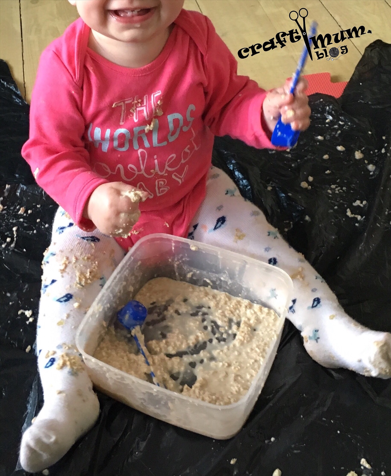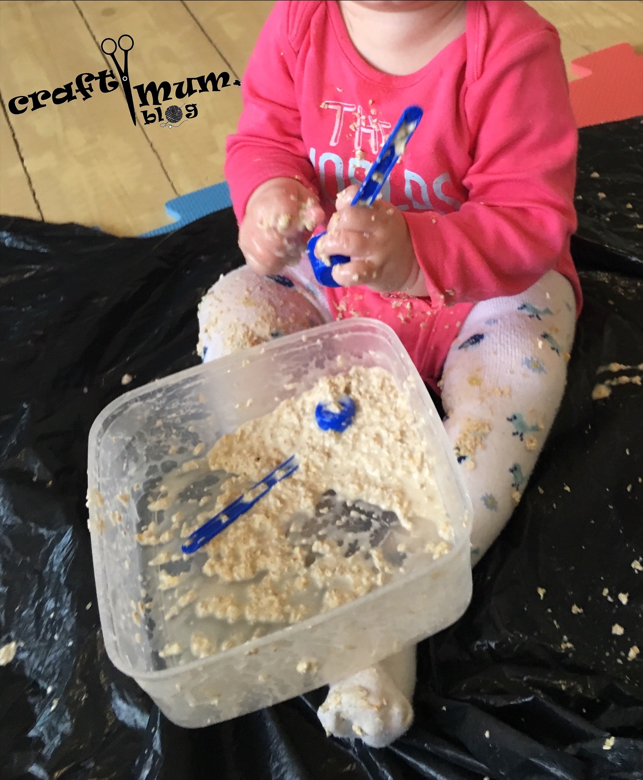 Baby safe and dead easy activity. A bowl of dry oats and one of mushy oats. You can add food colouring if you wish, for a more sensory experience.