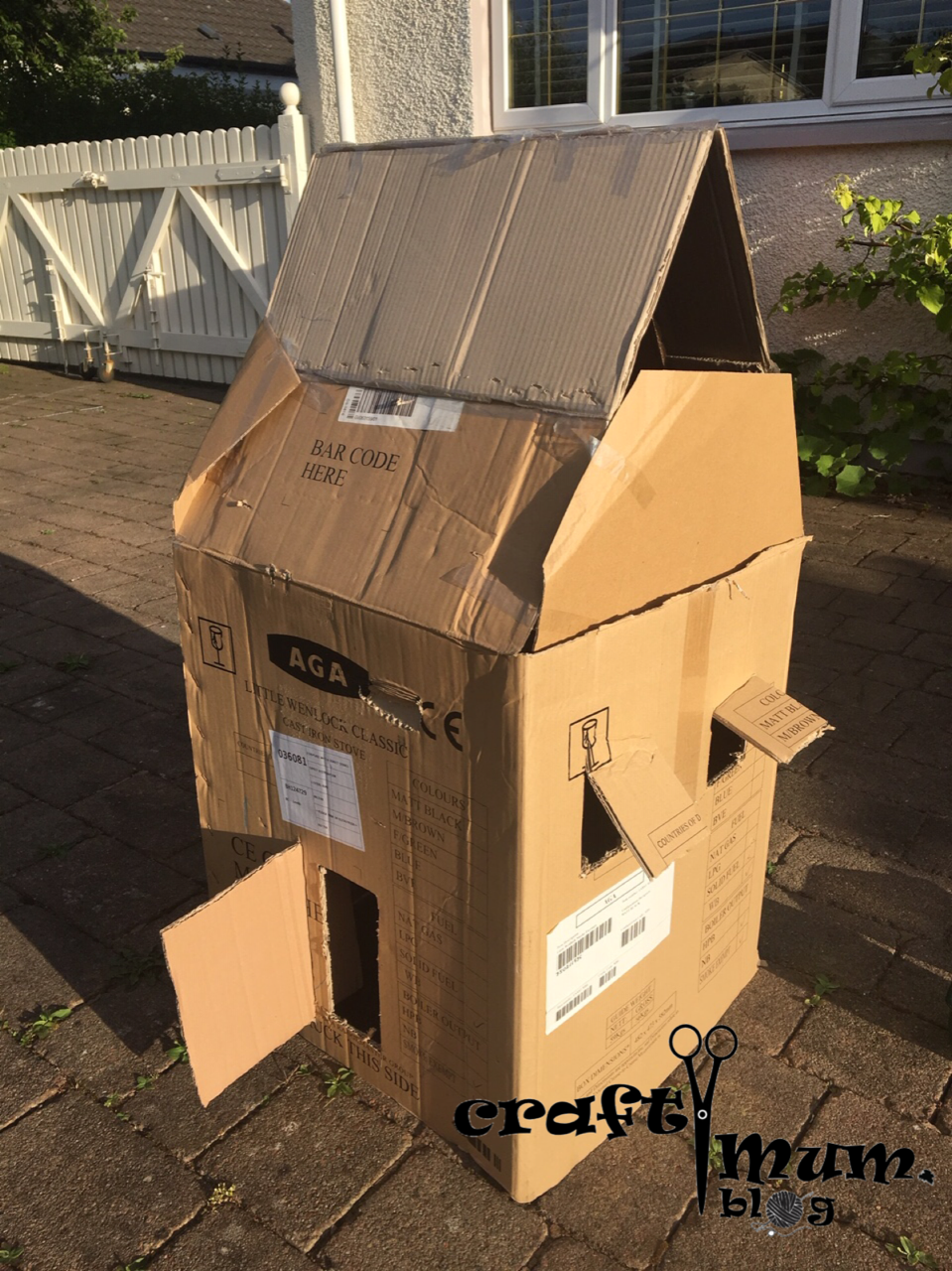 Lift the side flops of the big box and glue them together to make a roof for the house. Add more cardboard from the second box. Cut windows and doors for the house. Dress the child in paint friendly cloths.