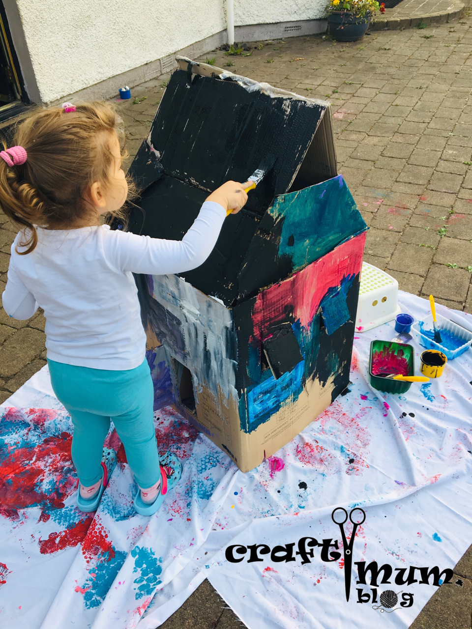 Place the house on the sheet and give the child paint and brushes to paint it. Let it dry and play with it with dolls or other figurines. This can be done outdoor or indoor. The activity kept my girl busy for a long time as she wanted to finish it in one go. Once you’re done playing with it please recycle.