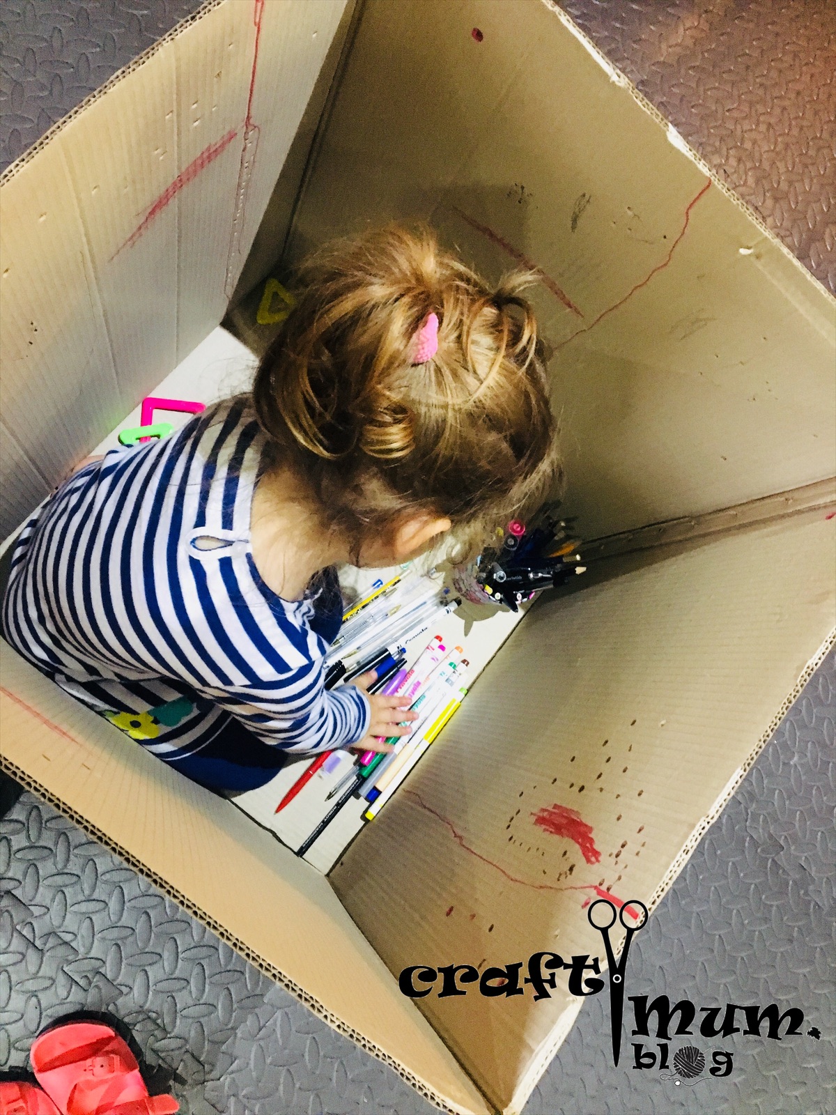 Cardboard boxes are a hit in our house. We use them to contain messy play, we paint or cut them in shapes, hide or build houses. Here’s one of the easiest activity for a child. Put them in a giant box and give them markers and pens.