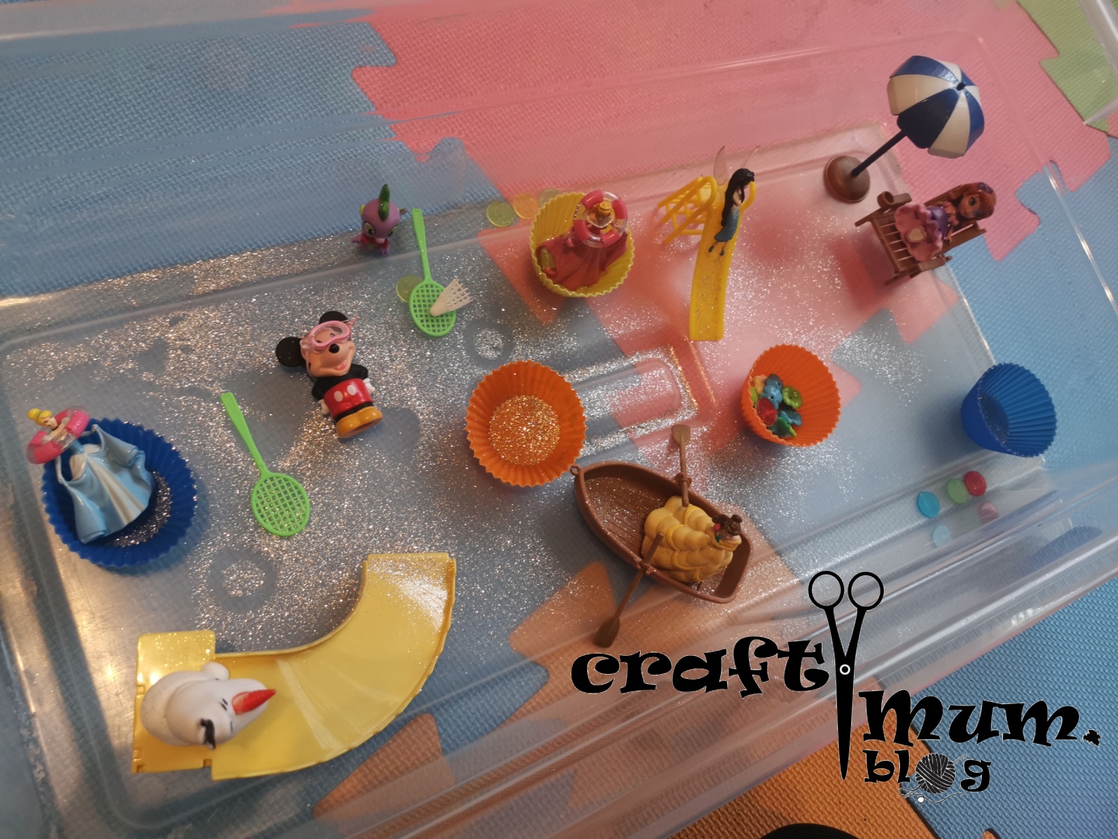 Place this mini world in a storage box. Make sure to use a towel under just in case kids get too excited. Put some summer music in the background.