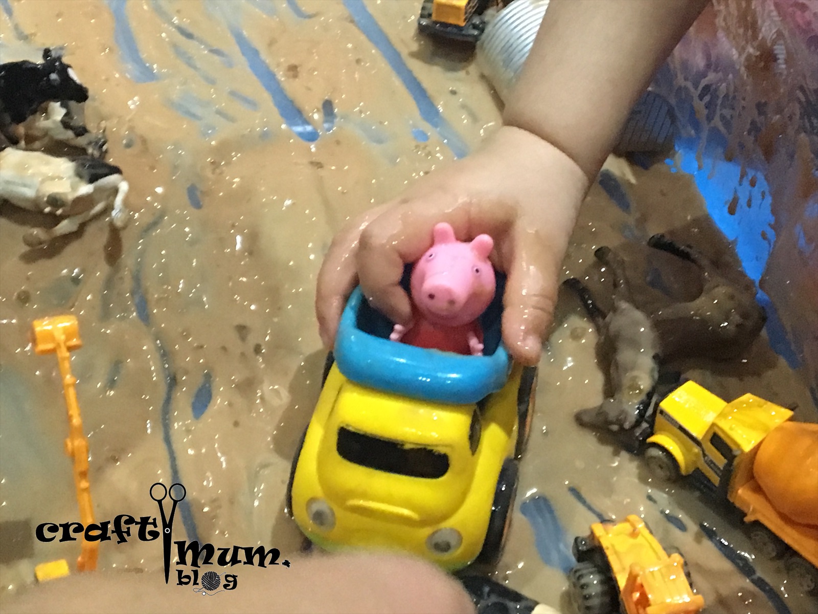 Easy messy play idea and totally edible. Muddy bin with cars, animals or Peppa figurines.