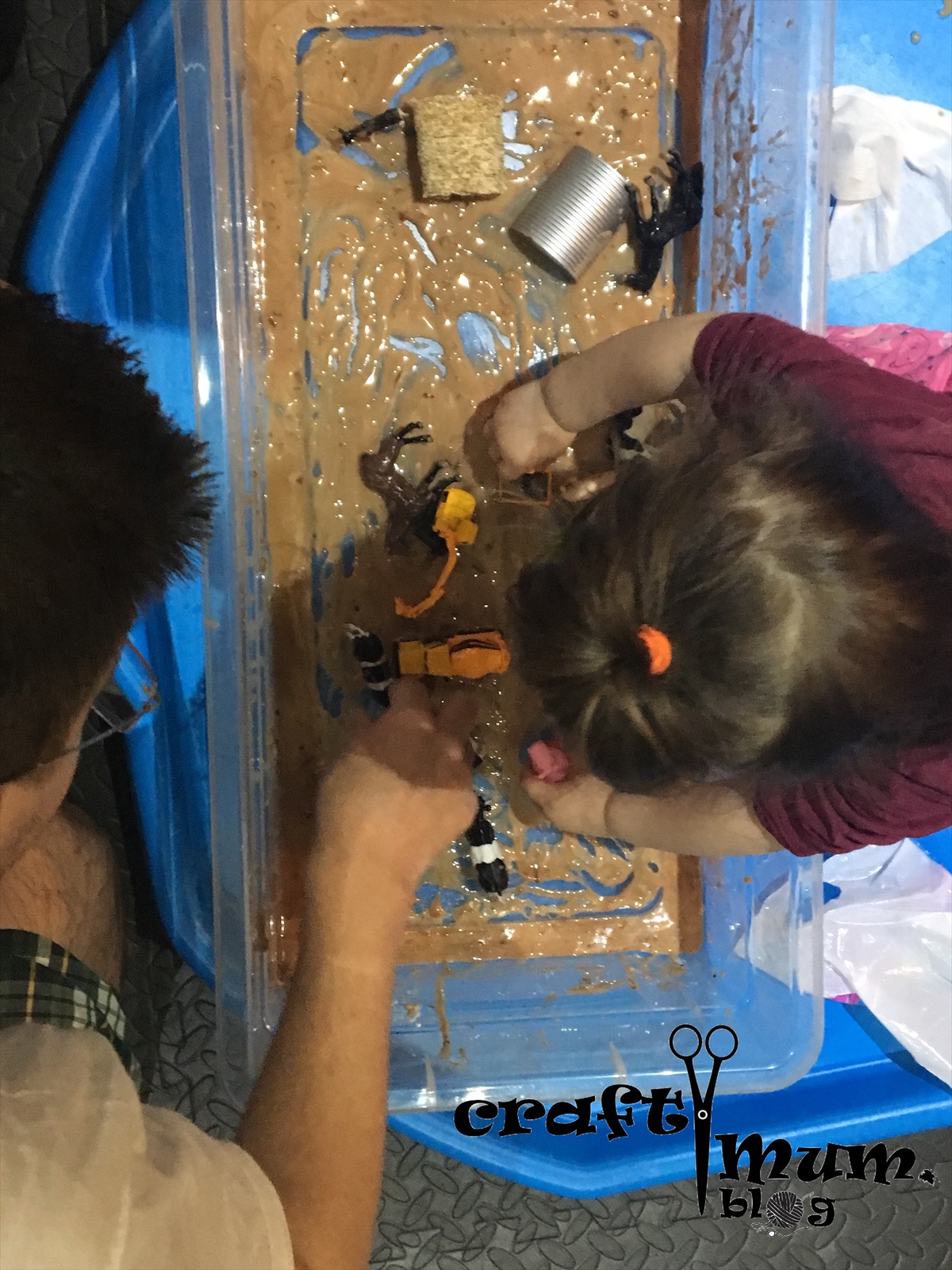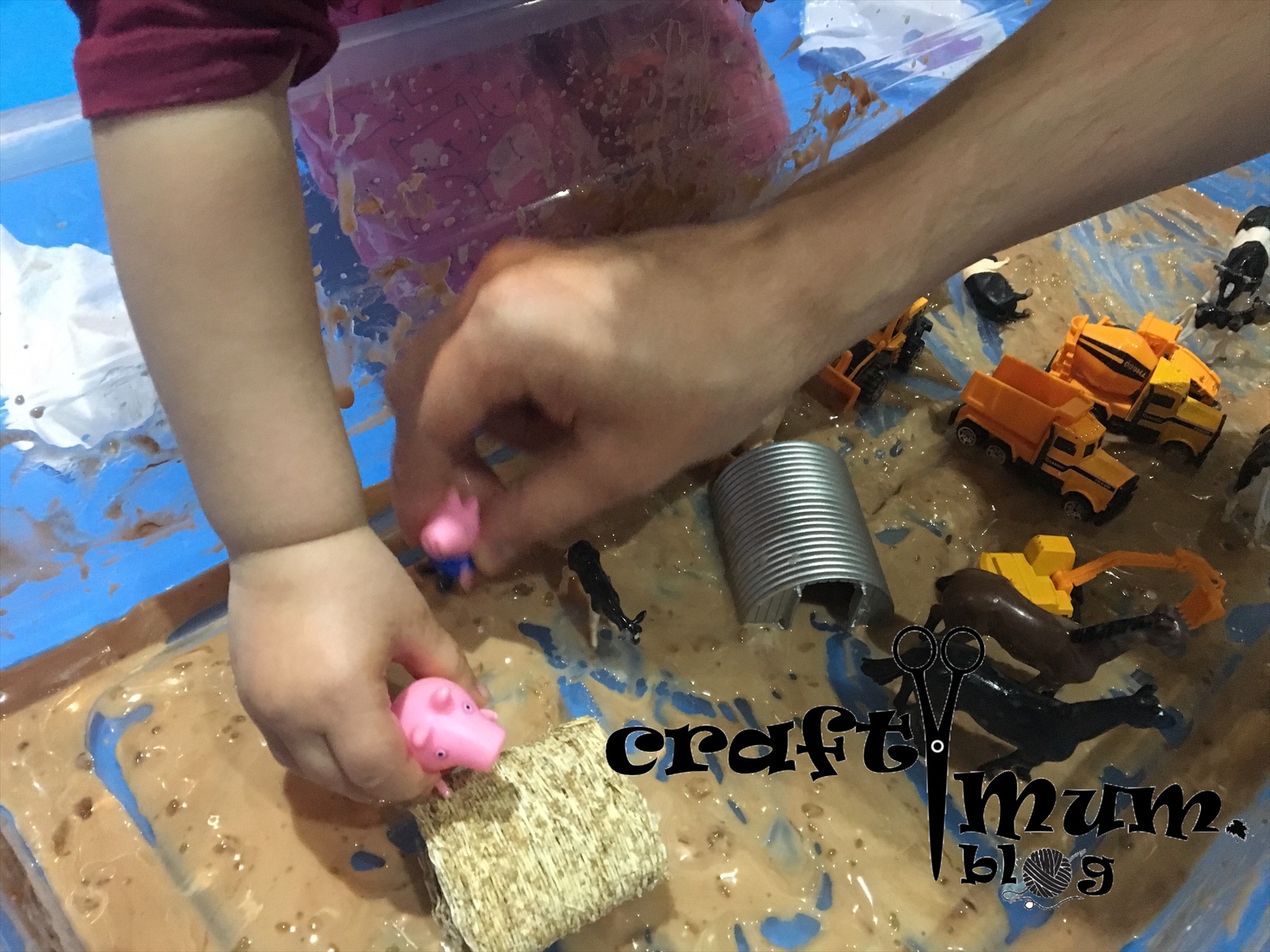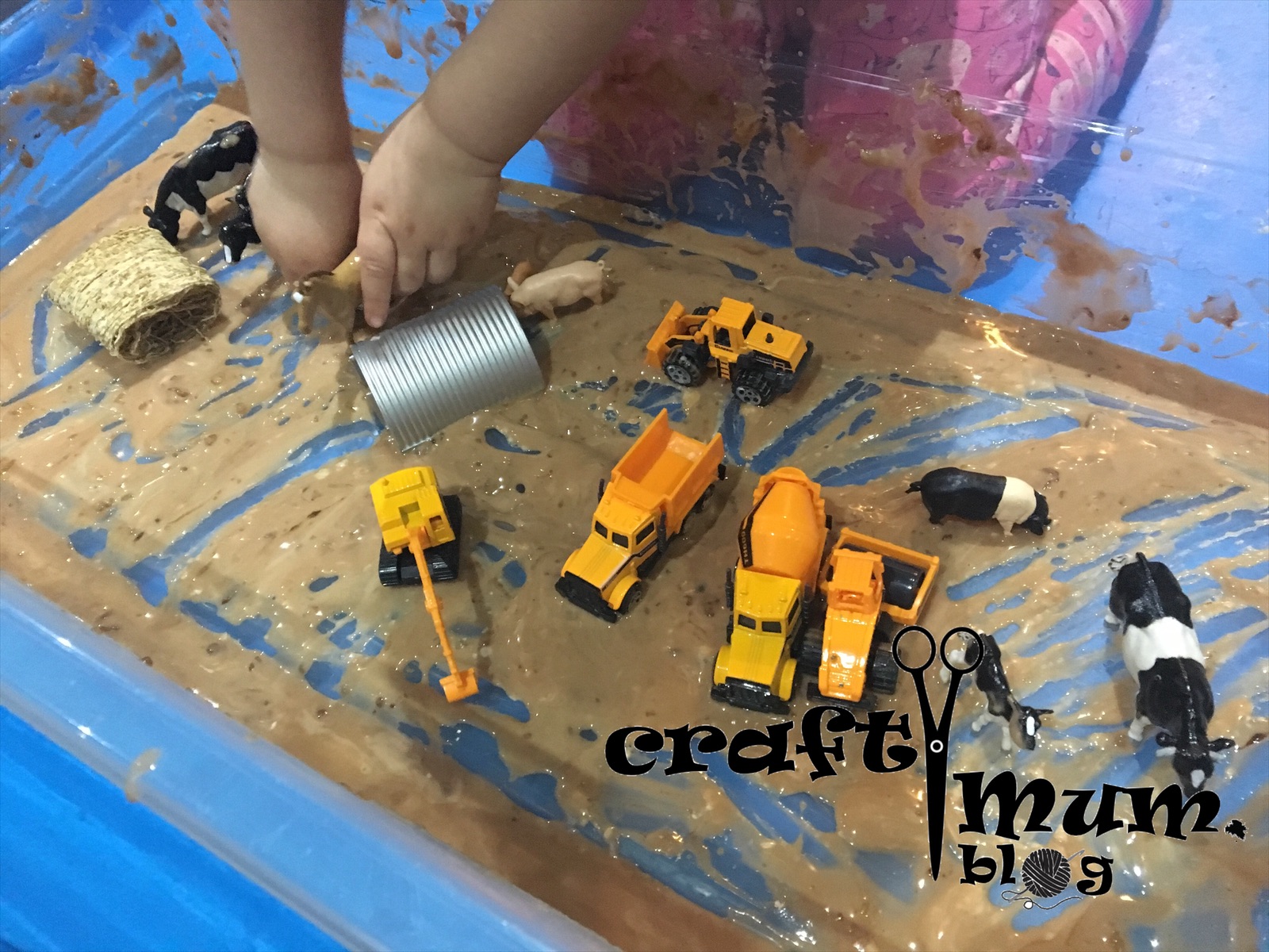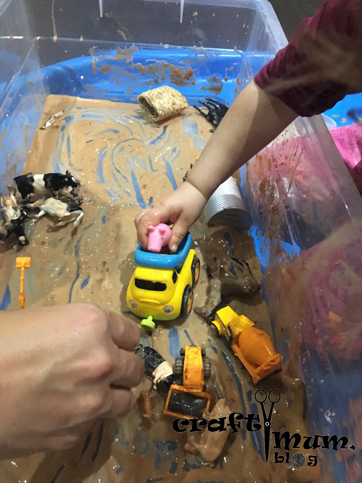 Mix some yogurt for with cacao to make the mud and add all the other toys in the bin.