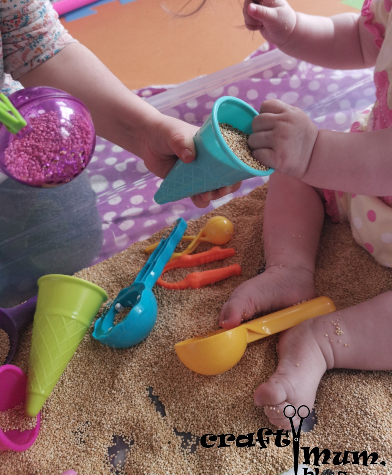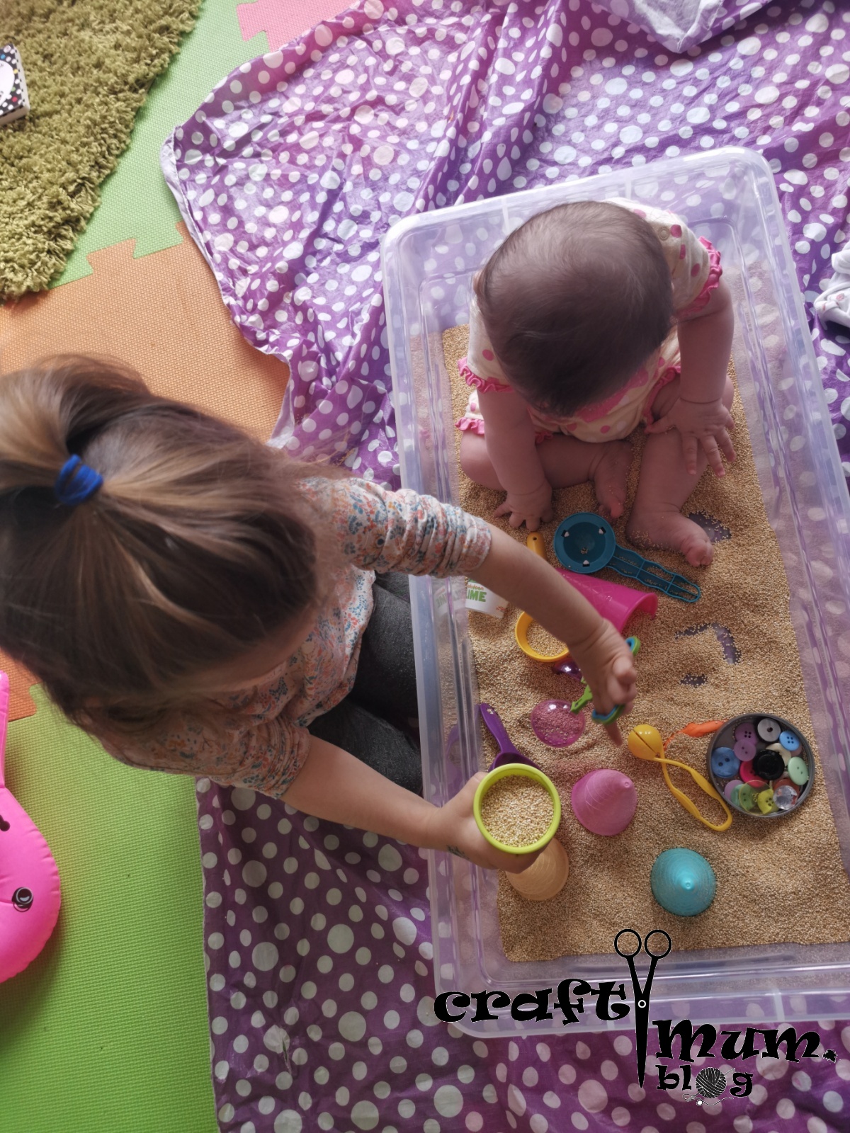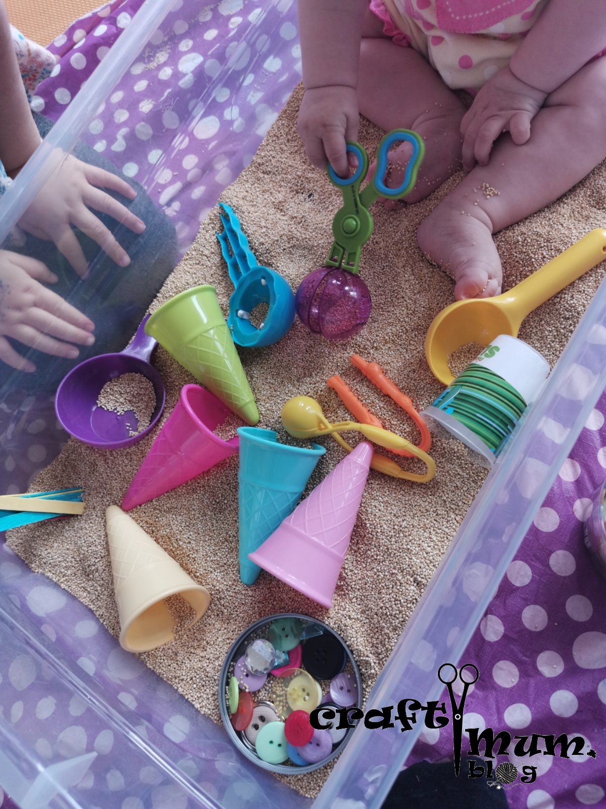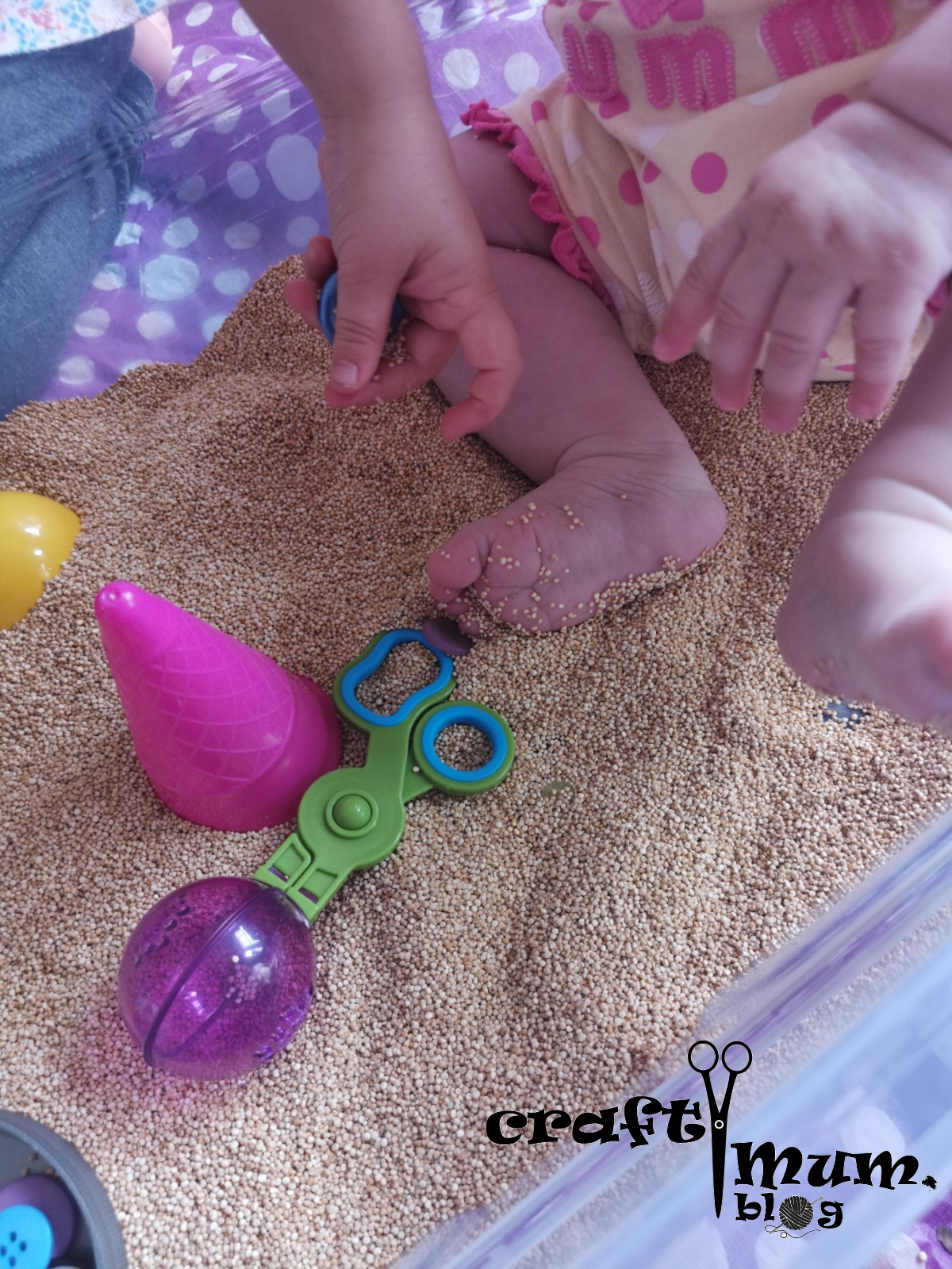 If you want to do this with a young baby you can, but you have to be careful. The seeds are tiny so not really chocking hazard but they stick on the skin and could get in their mouth, eyes and so on. My little one really enjoyed it and I kept the bin pretty basic. When she was done I added a few more bits and pieces for older one to play.