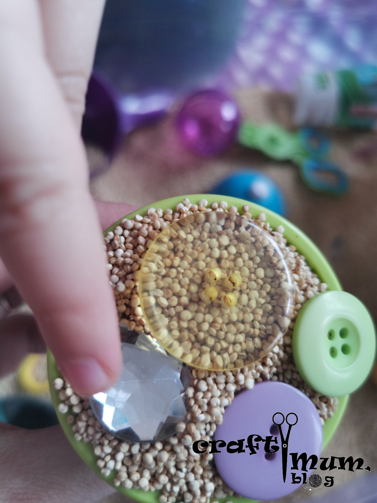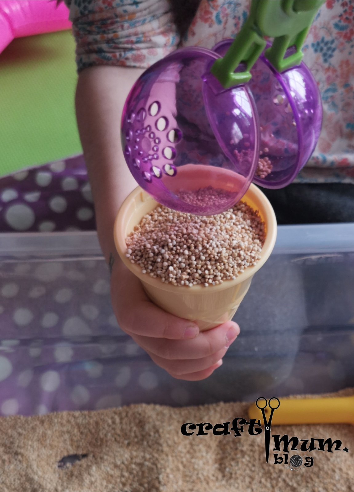 This came about from discovering a big bag of expired quinoa in my pantry. Hubby bought it, but I am not a fan and have managed to make it lost in the cupboard. It turned out to be an excellent sensory bin filler.