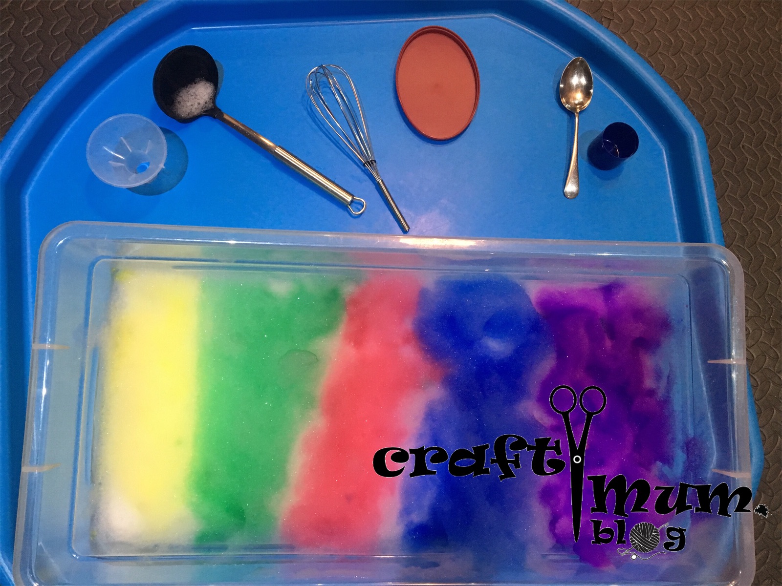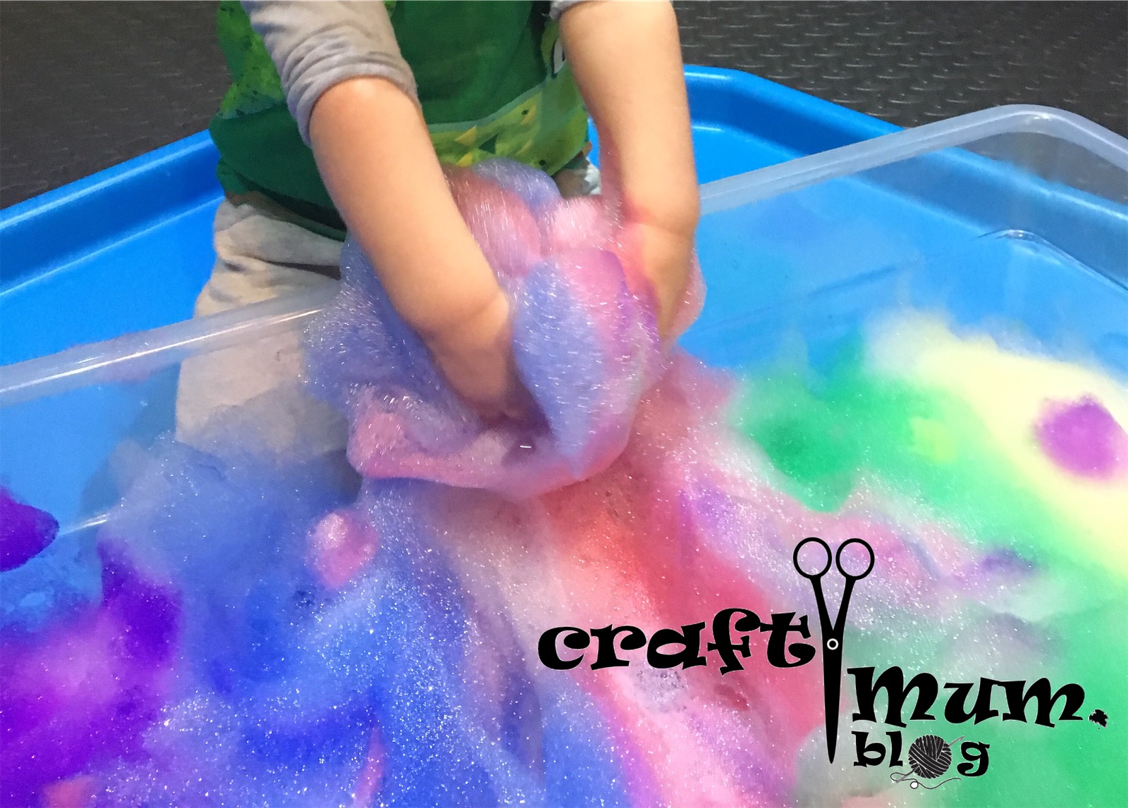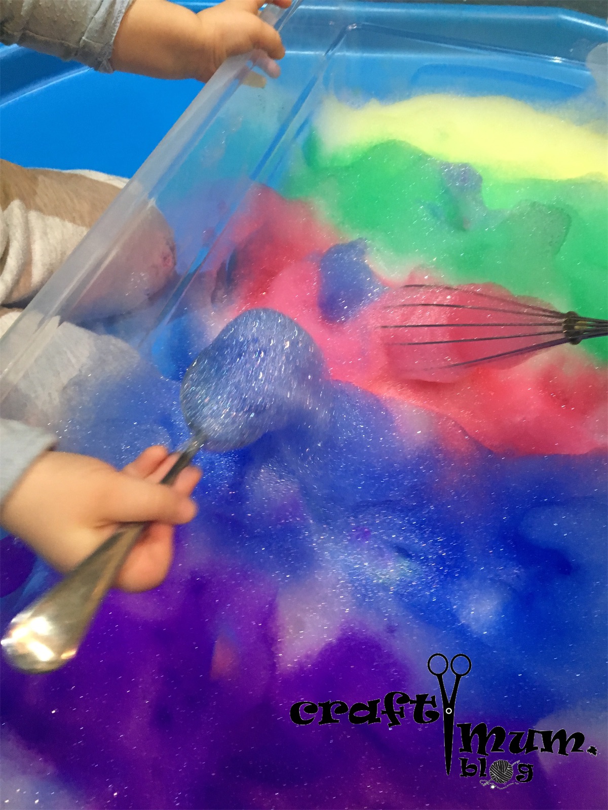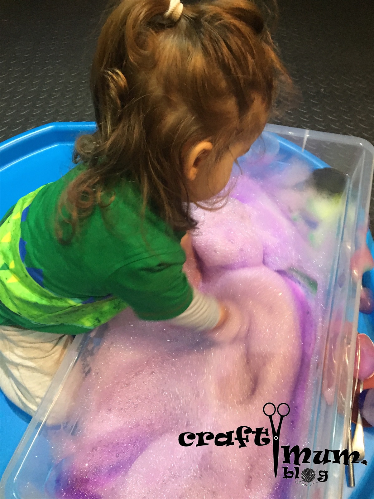 Mix dishwasher soap with water to make foam. Transfer the foam as it forms to the tray and keep mixing till you get the desired amount of bubbly fun. When you have enough mix a few drops of paint and stir.
