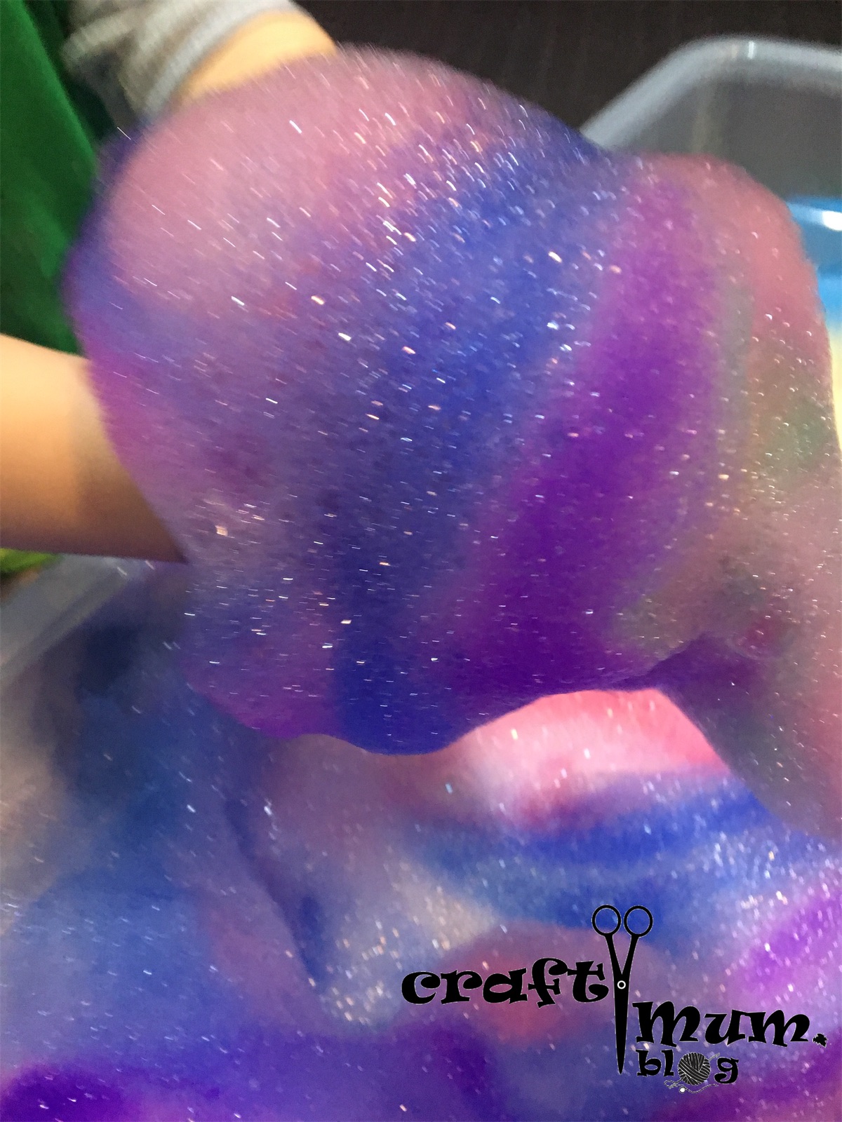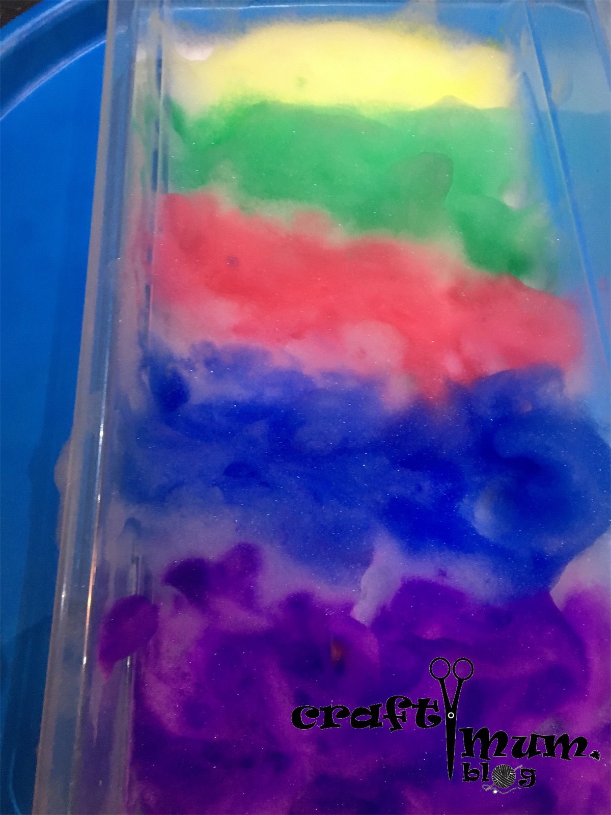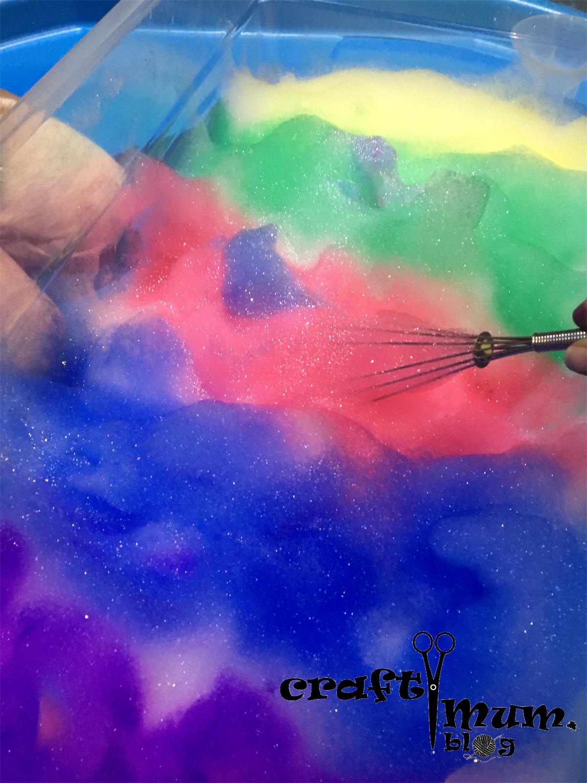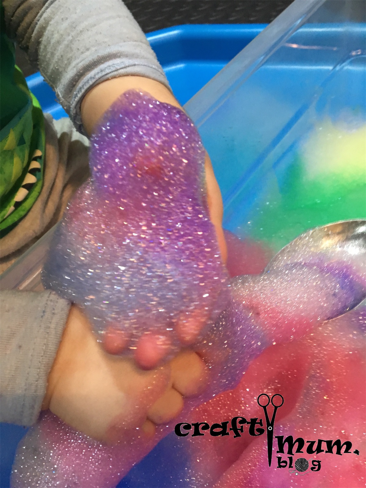 Mix dishwasher soap with water to make foam. Transfer the foam as it forms to the tray and keep mixing till you get the desired amount of bubbly fun. When you have enough mix a few drops of paint and stir.
