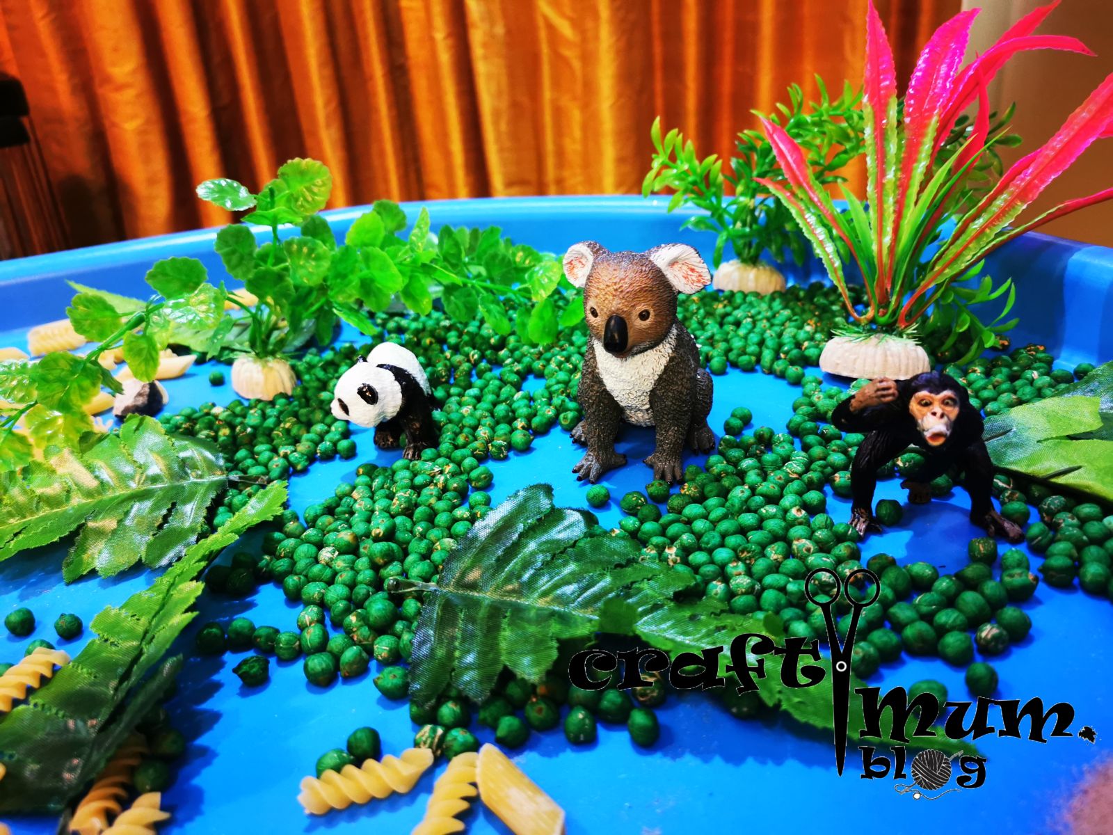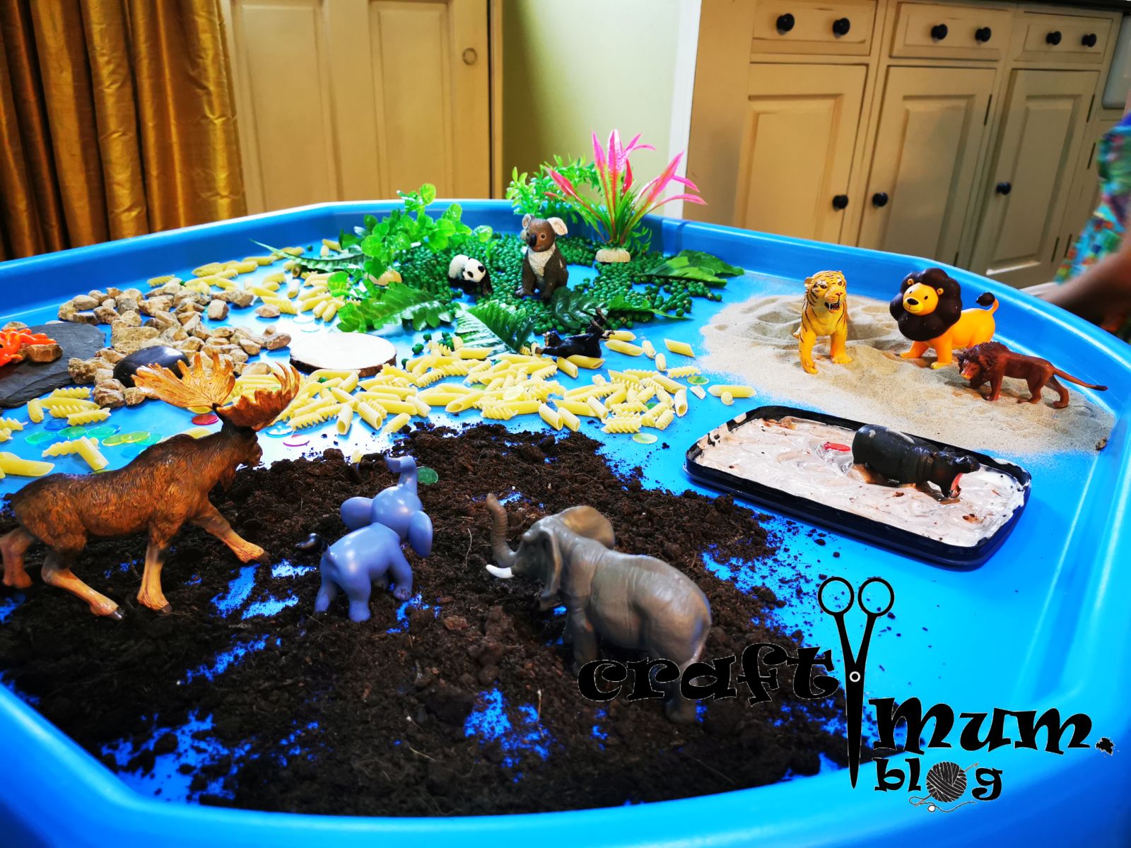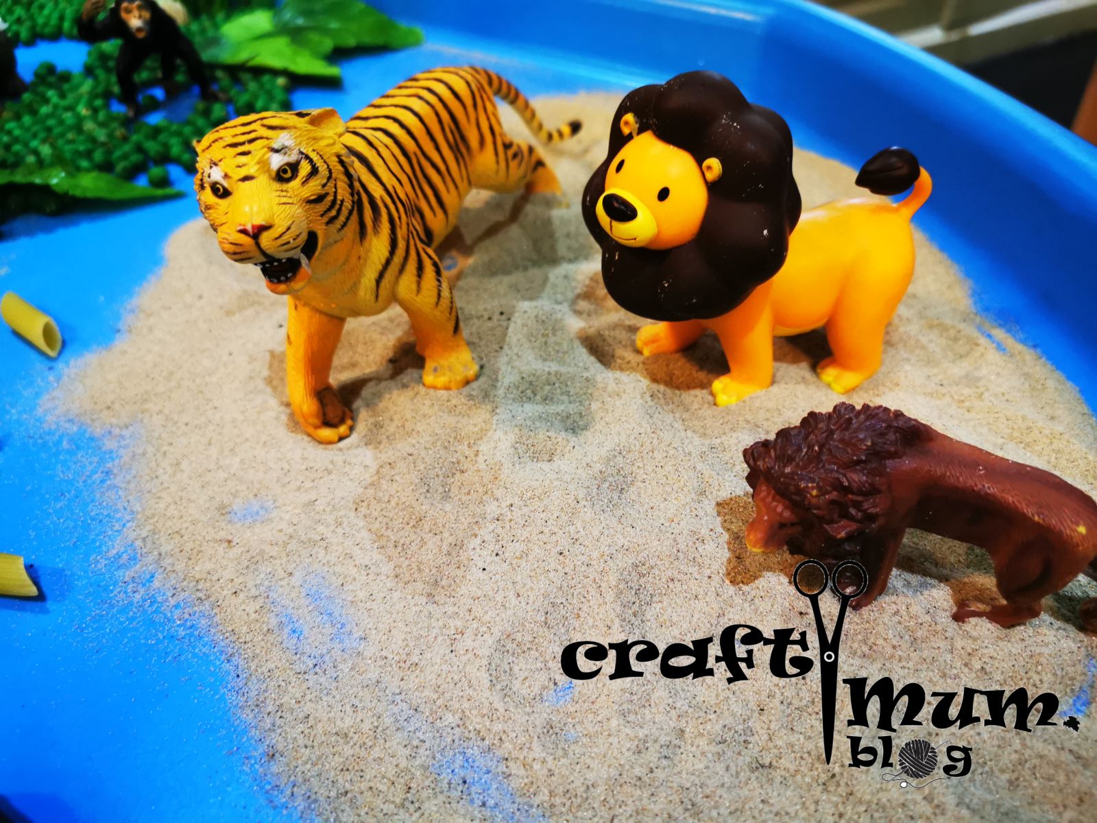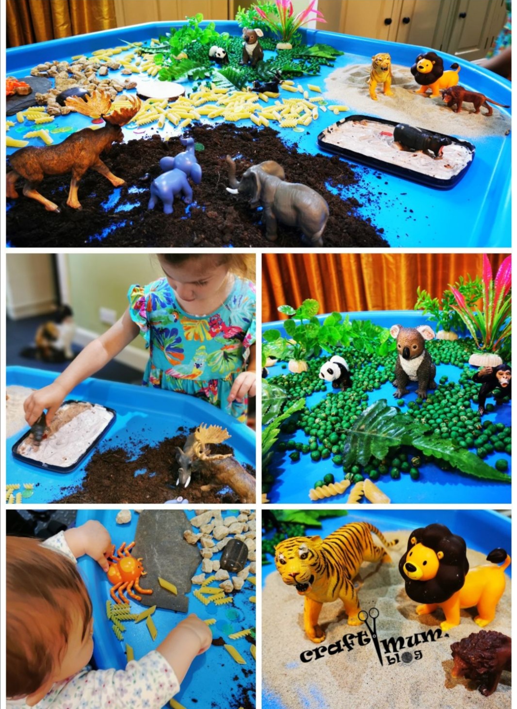 Get a bunch of jungle & savannah animals and create a setting using a variety of materials like sand, soil, trees, leaves, stones, pasta, cacao yogurt, pom poms and so on. Reuse what you can save.