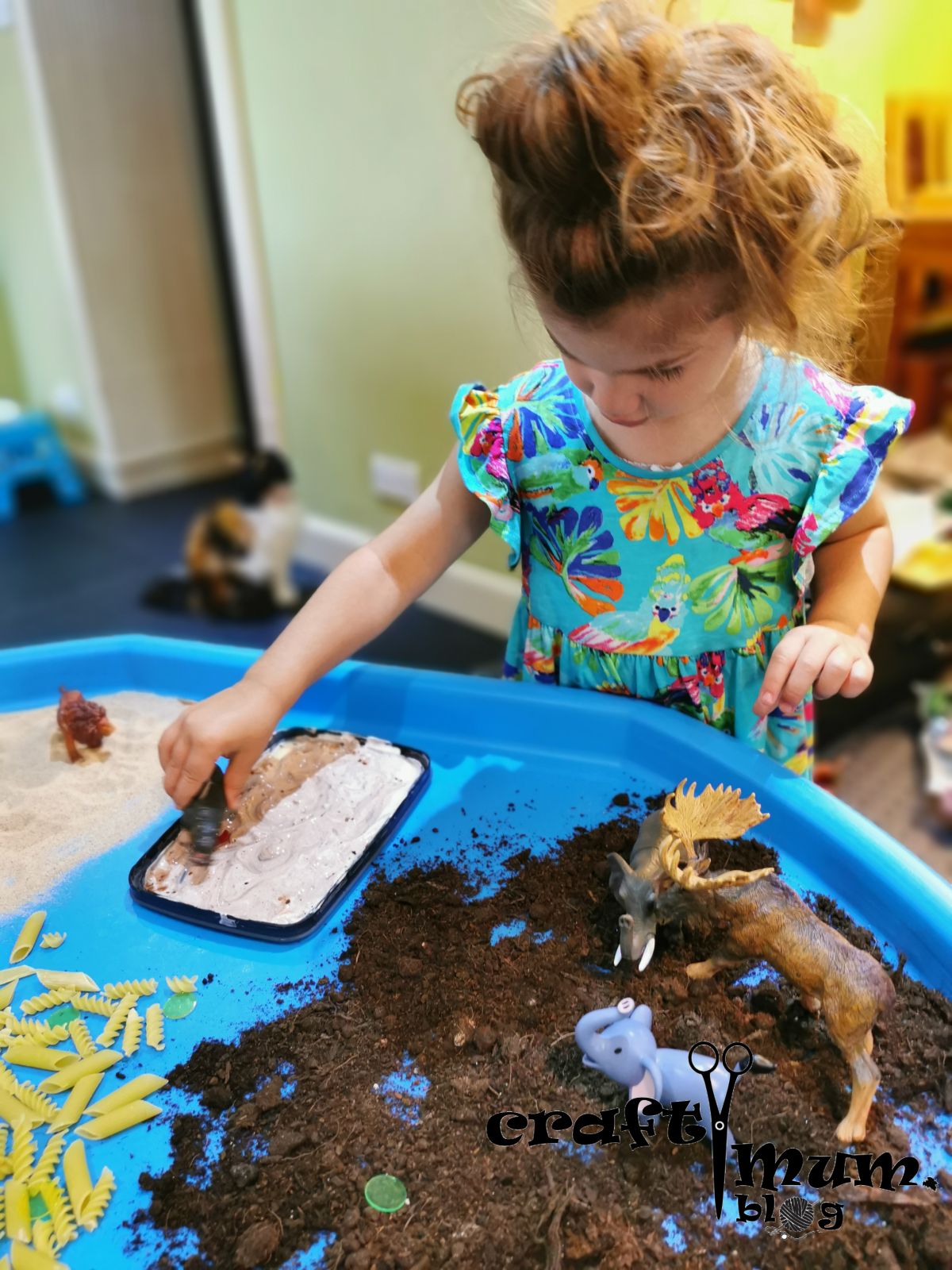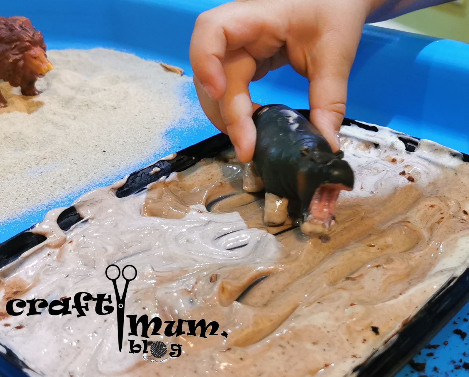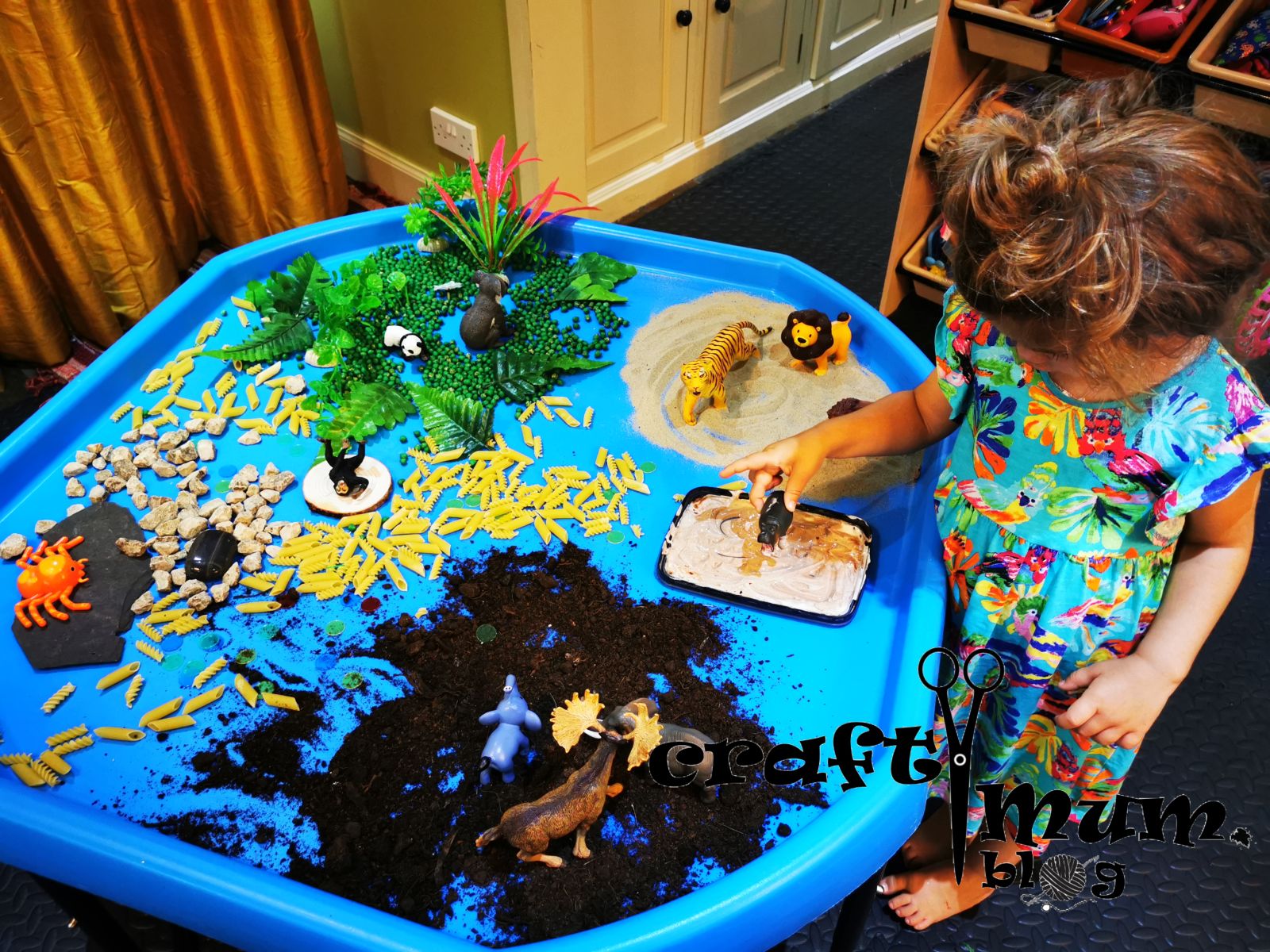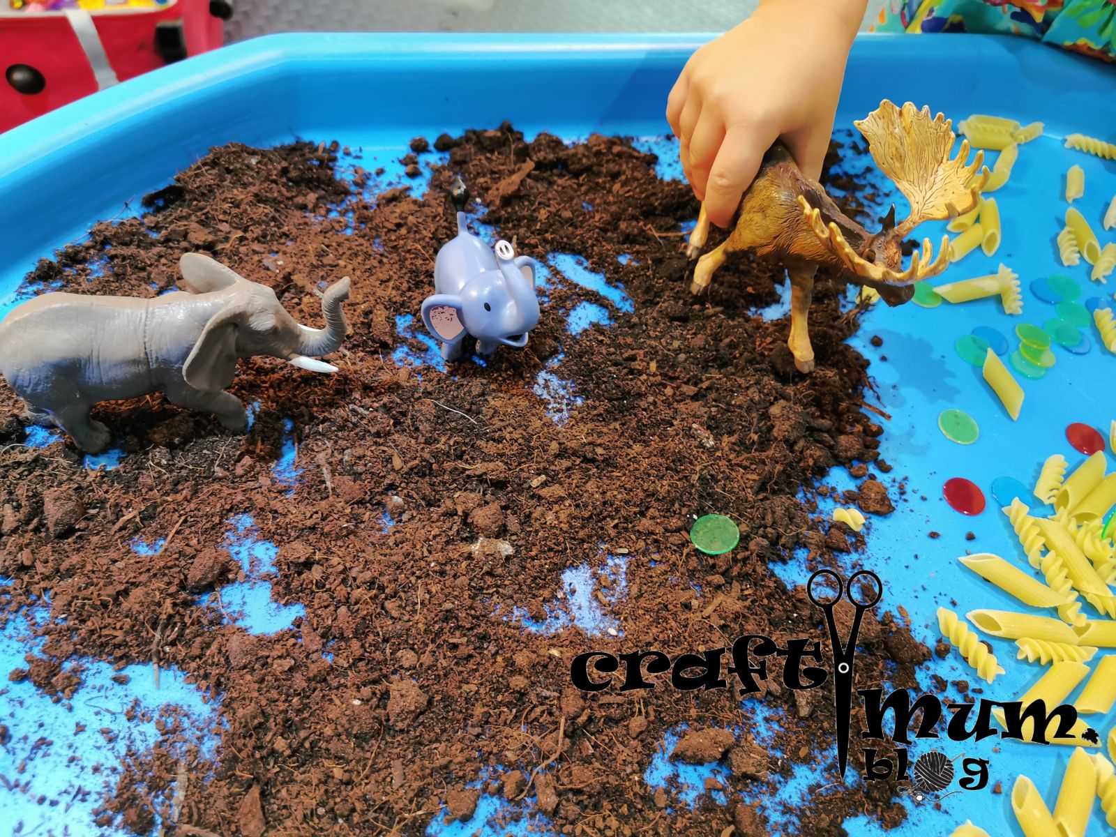 Get a bunch of jungle & savannah animals and create a setting using a variety of materials like sand, soil, trees, leaves, stones, pasta, cacao yogurt, pom poms and so on. Reuse what you can save.