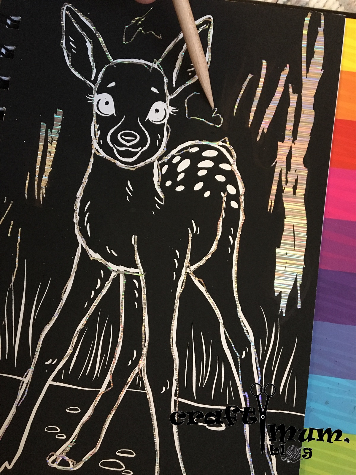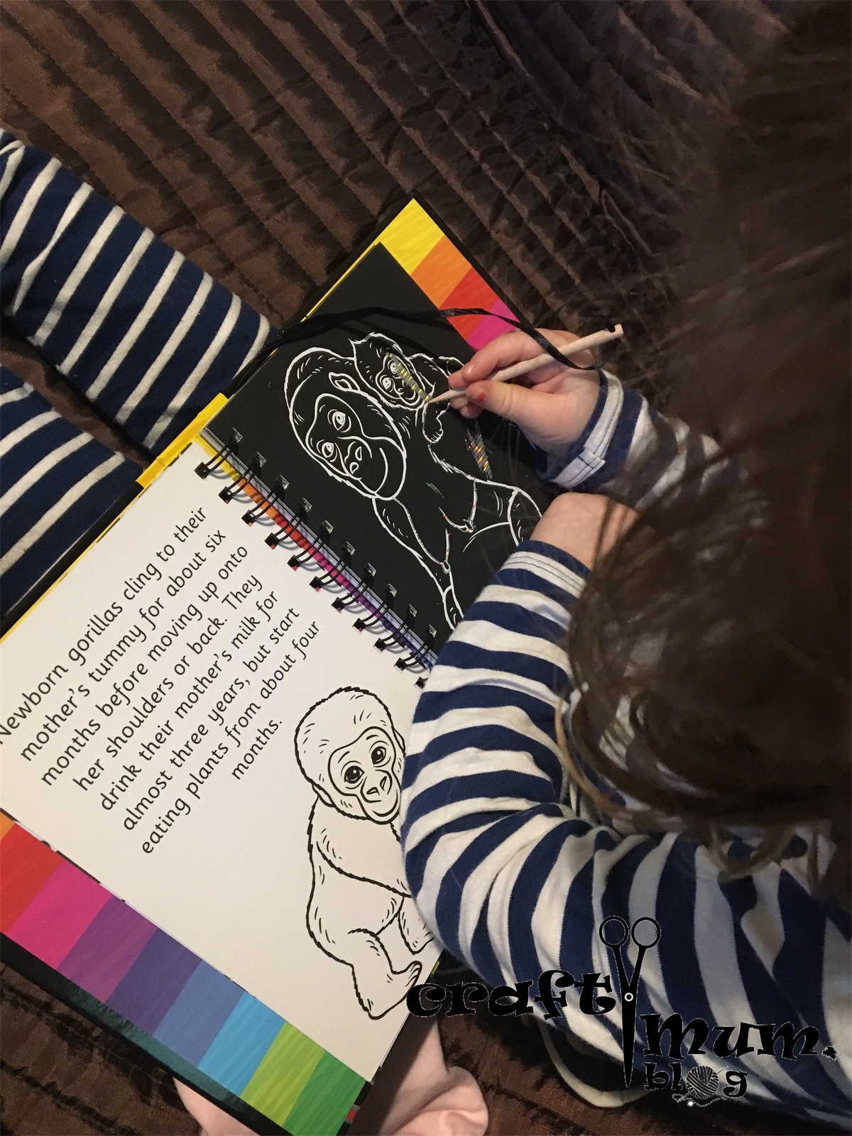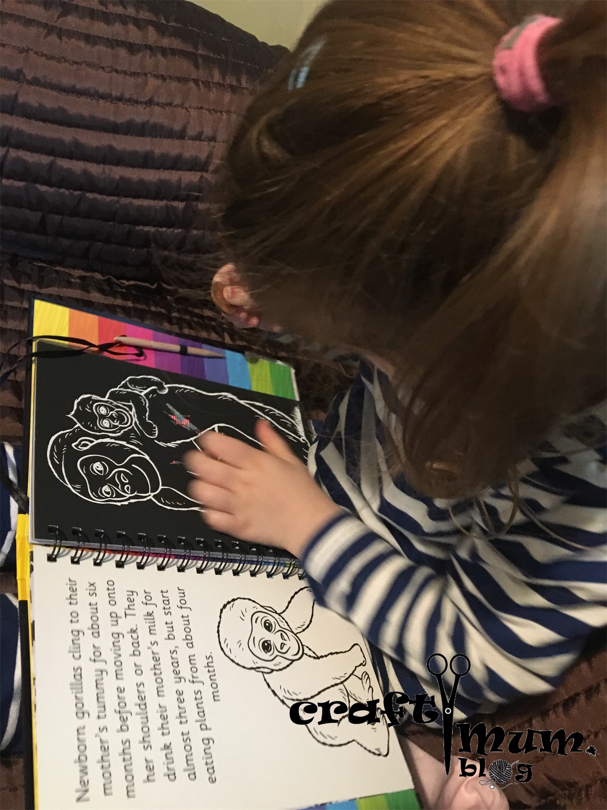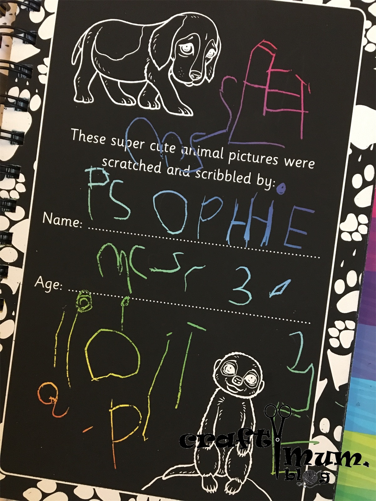 What a good buy! It has rainbow and foil scrach-off pages with a wooden pen. You are supposed to follow the outline of the animals to reveal the page beneath. Good to use with a coin as well. It has a little description about each animal and at the end of the book you have various step by step instructions on how to draw animals.