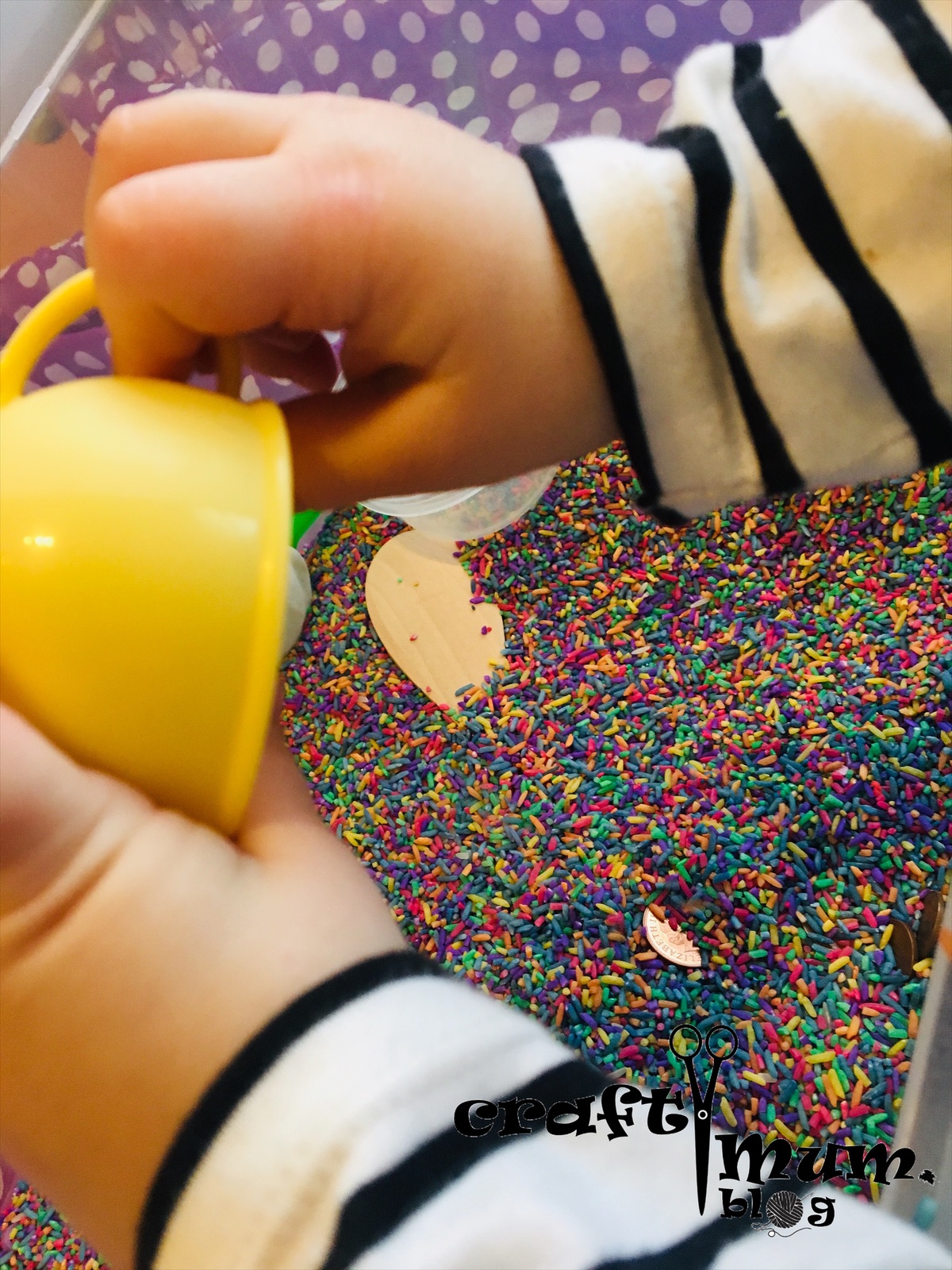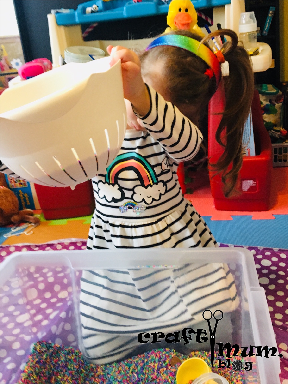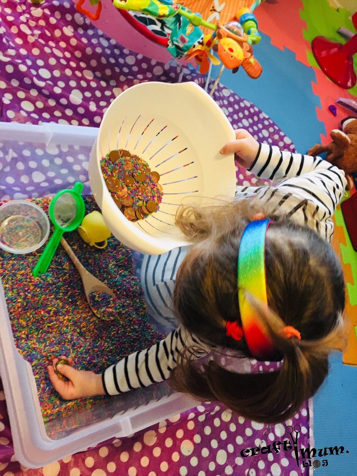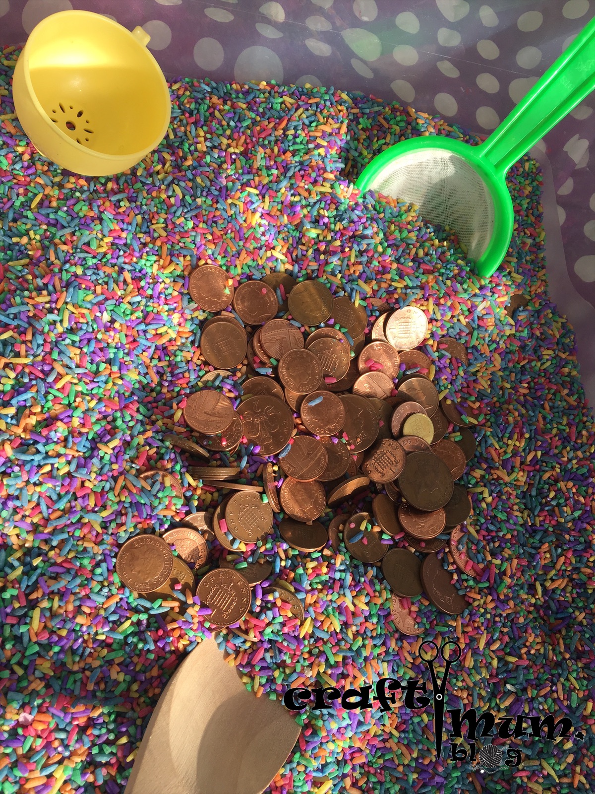 Mix coloured rice (recipe here) with a bunch of penny coins. Add some spoons and a colander to separate the rice from the coins. This activity works with many ingredients. Other examples could be: plain rice with coloured buttons, pasta or gravel. Happy hunting.