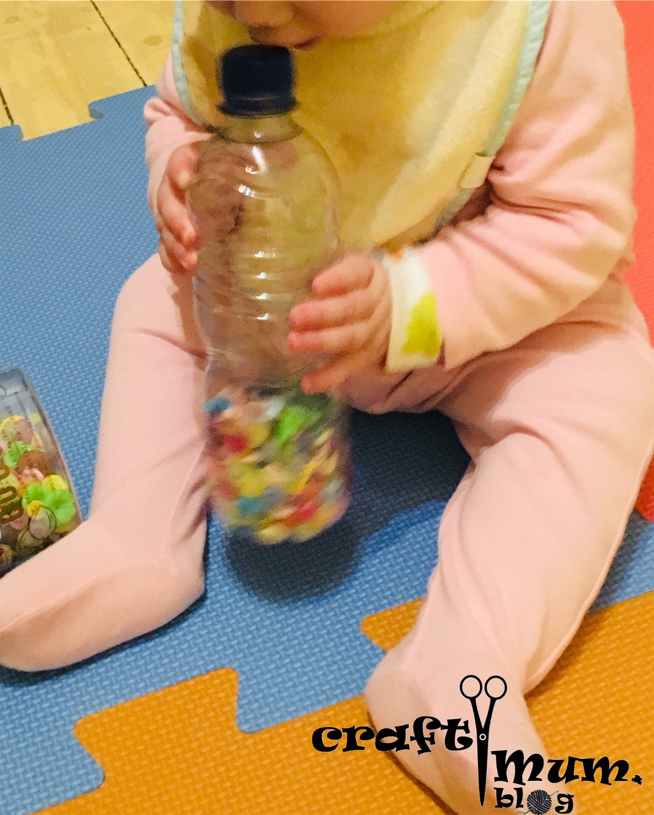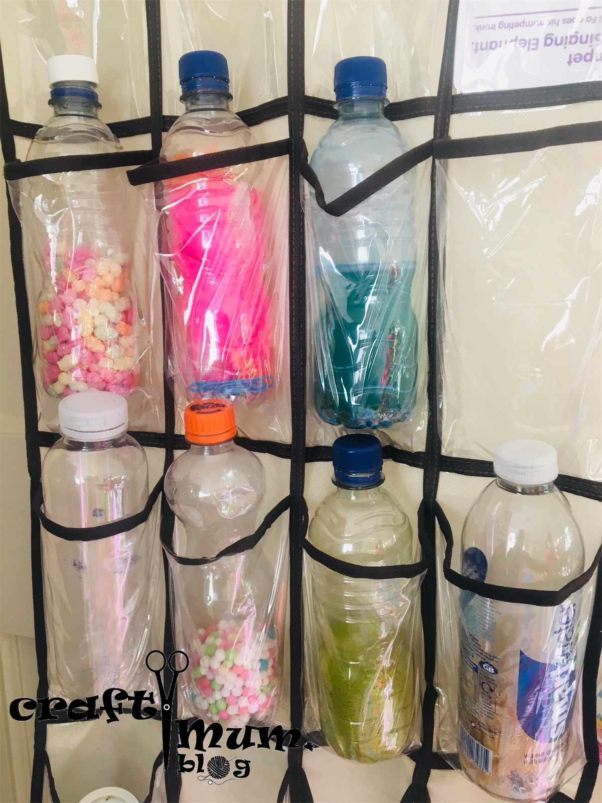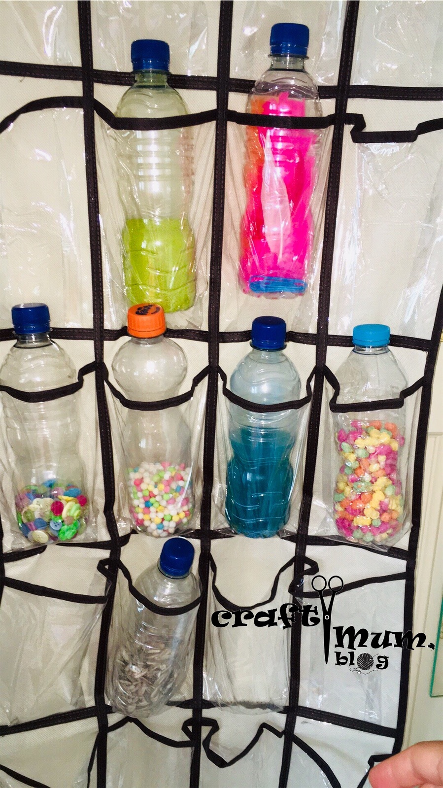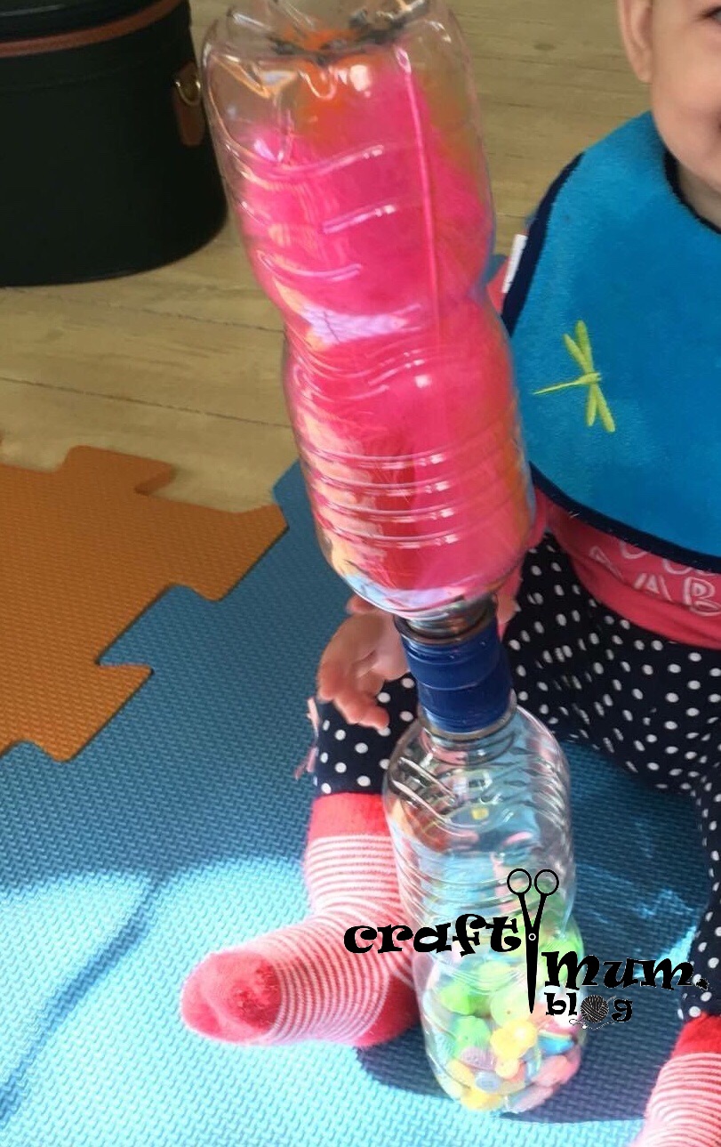 Just fill bottles with the materials and secure the lids in place. For babies use them as rattles. When they sit up you can stack them. My wee one used to love and laugh at the noise when they fell. When older you can open the content, empty it on the floor and ask them to put it back (with supervision). I used the button ones for that and she spent ages doing this. It’s a great exercise for fine motor skills and precision. Now at 3 years plus she uses them for pretend play, cooking and other imaginative play. I store them in a pocket hanging shoe holder.