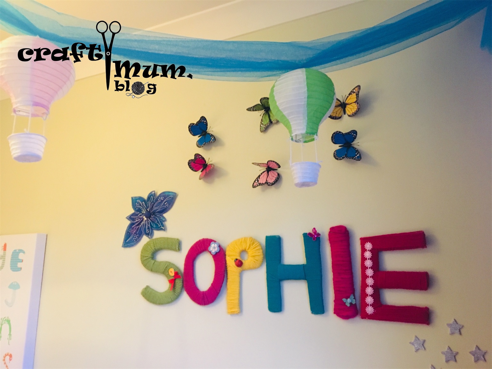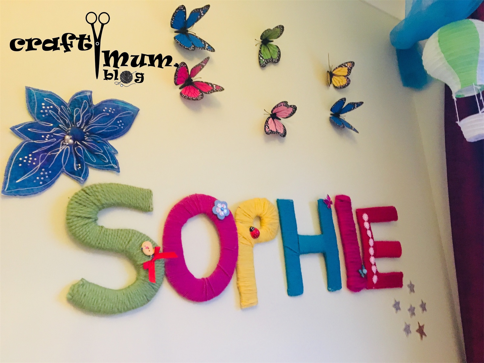 Put glue on the sides of the letters to hold the yarn in place and start wrapping the yarn around. If using the glue gun, work in sections to avoid burning. Stick decorative buttons on the letters and hang them on the wall to create your desired text.